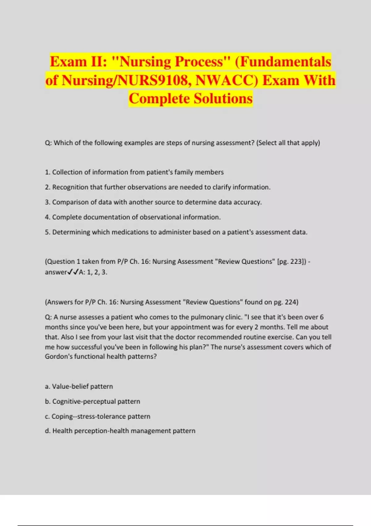Exam II: "Nursing Process" (Fundamentals of Nursing/NURS9108, NWACC) Exam With Complete Solutions Q: Which of the following examples are steps of nursing assessment? (Select all that apply) 1. Collection of information from patient's family members 2. Recognition that further observations are needed to clarify information. 3. Comparison of data with another source to determine data accuracy. 4. Complete documentation of observational information. 5. Determining which medications to administer based on a patient's assessment data. (Question 1 taken from P/P Ch. 16: Nursing Assessment "Review Questions" [pg. 223]) - answerA: 1, 2, 3. (Answers for P/P Ch. 16: Nursing Assessment "Review Questions" found on pg. 224) Q: A nurse assesses a patient who comes to the pulmonary clinic. "I see that it's been over 6 months since you've been here, but your appointment was for every 2 months. Tell me about that. Also I see from your last visit that the doctor recommended routine exercise. Can you tell me how successful you've been in following his plan?" The nurse's assessment covers which of Gordon's functional health patterns? a. Value-belief pattern b. Cognitive-perceptual pattern c. Coping--stress-tolerance pattern d. Health perception-health management pattern (Question 2 taken from P/P Ch. 16: Nursing Assessment "Review Questions" [pg. 223]) - answerA: (d.) (Answers for P/P Ch. 16: Nursing Assessment "Review Questions" found on pg. 224) Q: When a nurse conducts an assessment, data about a patient often comes from which of the following sources? (Select all that apply) 1. An observation of how a patient turns and moves in bed. 2. The unit policy and procedure manual. 3. The care recommendations of a physical therapist. 4. The results of a diagnostic x-ray film. 5. Your experiences in caring for other patients with similar problems. (Question 3 taken from P/P Ch. 16: Nursing Assessment "Review Questions" [pg. 223]) - answerA: 1, 3, 4. (Answers for P/P Ch. 16: Nursing Assessment "Review Questions" found on pg. 224) Q: The nurse observes a patient walking down the hall with a shuffling gate. When the patient returns to bed, the nurse checks the strength of the patient's legs. The nurse applies the information gained to suspect that the patient has a mobility problem. This conclusion is an example of: a. Cue b. Reflection c. Clinical inference 4. Probing (Question 4 taken from P/P Ch. 16: Nursing Assessment "Review Questions" [pg. 223]) - answerA: (c.) (Answers for P/P Ch. 16: Nursing Assessment "Review Questions" found on pg. 224) Q: A 72-year-old male patient comes to the health clinic for an annual follow-up. The nurse enters the patient's room and notices him to be diaphoretic, holding his chest and breathing with difficulty. The nurse immediately checks the patient's heart rate and blood pressure and asks him, "Tell me where your pain is." Which of the following assessment approaches does this scenario describe? a. Review of systems approach. b. Use of a structured database format. c. Back channeling. d. A problem-oriented approach. (Question 5 taken from P/P Ch. 16: Nursing Assessment "Review Questions" [pg. 223]) - answerA: (d.) (Answers for P/P Ch. 16: Nursing Assessment "Review Questions" found on pg. 224) Q: The nurse asks a patient, "describe for me a typical night's sleep. What do you do to fall asleep? Do you have difficulty falling or staying asleep?" This series of questions would likely occur during which phase of a patient-centered interview? a. Orientation b. Working phase c. Data validation d. Termination (Question 6 taken from P/P Ch. 16: Nursing Assessment "Review Questions" [pg. 223]) - answerA: (b.) (Answers for P/P Ch. 16: Nursing Assessment "Review Questions" found on pg. 224)** Q: A nurse is assigned to a 42-year-old mother of 4 who weighs 136.2kg (300lbs), has diabetes, and works part time in the kitchen of a restaurant. The patient is facing surgery for gallbladder disease. Which of the following approaches demonstrates the nurse's cultural competence in assessing the patient's health care problems? a. "I can tell that your eating habits have lead to your diabetes. Is that right?" b. "It's been difficult for people to find jobs. Is that why you work part time?" c. "You nave four children; do you have any concerns about going home and caring for them?" d. "I wish patients understood how overeating affects their health." (Question 7 taken from P/P Ch. 16: Nursing Assessment "Review Questions" [pg. 223]) - answerA: (c.) (Answers for P/P Ch. 16: Nursing Assessment "Review Questions" found on pg. 224) Q: Which type of interview question does the nurse first use when assessing the reason for a patient seeking health care? a. Probing b. Open-ended c. Problem-oriented d. Confirmation