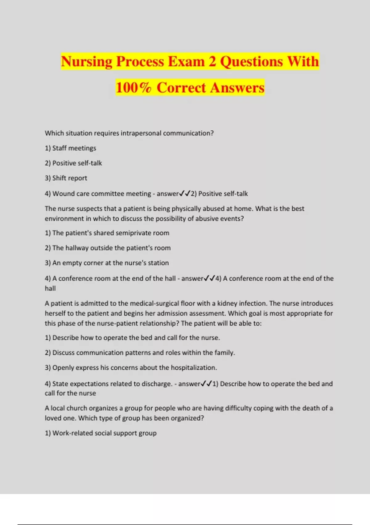 Nursing Process Exam 2 Questions With 100% Correct Answers Which situation requires intrapersonal communication? 1) Staff meetings 2) Positive self-talk 3) Shift report 4) Wound care committee meeting - answer2) Positive self-talk The nurse suspects that a patient is being physically abused at home. What is the best environment in which to discuss the possibility of abusive events? 1) The patient's shared semiprivate room 2) The hallway outside the patient's room 3) An empty corner at the nurse's station 4) A conference room at the end of the hall - answer4) A conference room at the end of the hall A patient is admitted to the medical-surgical floor with a kidney infection. The nurse introduces herself to the patient and begins her admission assessment. Which goal is most appropriate for this phase of the nurse-patient relationship? The patient will be able to: 1) Describe how to operate the bed and call for the nurse. 2) Discuss communication patterns and roles within the family. 3) Openly express his concerns about the hospitalization. 4) State expectations related to discharge. - answer1) Describe how to operate the bed and call for the nurse A local church organizes a group for people who are having difficulty coping with the death of a loved one. Which type of group has been organized? 1) Work-related social support group 2) Therapy group 3) Task group 4) Community committee - answer2) Therapy group A mother comes to the emergency department after receiving a phone call informing her that her son was involved in a motor vehicle accident. When she approaches the triage desk, she frantically asks, "How is my son?" Which response by the nurse is best? 1) "He's being examined now; he's awake and talking. We'll take you to see him soon." 2) "Don't worry, I'm sure he'll be fine; we have an excellent trauma team caring for him." 3) "Everything will be okay; please take a seat and I'll check on him for you." 4) "Your son is strong and has youth on his side; I'm sure he'll be fine." - answer1) "He's being examined now; he's awake and talking. We'll take you to see him soon." During a presentation at a nursing staff meeting, the unit manager speaks very slowly ina monotone voice. She uses medical and technical terminology to convey her message. Dressed in business attire, the manager stands erect and smiles occasionally while speaking. Which elements of her approach are likely to cause the staff to lose interest in what she has to say? Select all that apply. 1) Slow speech 2) Monotone 3) Occasional smile 4) Formal dress - answer1) Slow speech 2) Monotone Which of the following leadership theories emphasizes the importance of understanding the factors affecting a particular group of people in a particular environment and varies the type of leadership based on these factors? 1) Situational 2) Behavioral 3) Scientific management 4) Trait - answer1) Situational The first step in conflict resolution is to 1) generate possible solutions. 2) search the literature. 3) evaluate suggested solutions. 4) identify the problem. - answer4) Identify the problem A ______________ is someone with more experience who provides practical teaching, role modeling, and guidance for a student or new employee. - answerpreceptor What is it that distinguishes transformational leadership from other leadership styles? Transformational leadership 1) involves shared planning. 2) fosters motivation. 3) uses vision to influence others. 4) provides rewards to workers. - answer3) uses vision to influence others. What is the main reason a nurse manager needs to have clinical expertise? 1) To analyze how much time is spent on a given task 2) To evaluate and help staff members develop their skills 3) To provide patient care during staff absences 4) To establish the manager's authority among staff - answer2) To evaluate and help staff members develop their skills The nurse is thinking about changing jobs. To plan for this, the nurse performs a SOAR analysis. In one column, the nurse writes, "My vision for my career over the next 10 years is to work where I can spend most of my time providing direct patient care. There is one hospital and one clinic that claim to be caring institutions." Which section of the SOAR analysis is the nurse working on? 1) Strengths 2) Opportunities 3) Aspirations 4) Results - answer2) Opportunities Theories that focus on what the leader does are called: 1) Trait theories. 2) Behavioral theories. 3) Situational theories. 4) Transformational theories. - answer2) Behavioral theories At a recent nurse staff meeting, the chief nursing officer (CNO) announced that all nursing staff would work 12-hour shifts on a day-night rotation schedule that would alternate every 6 weeks. The CNO announced that she made this decision as a means to solve discord between the day- and night-shift nurses. She explained that this plan will allow the staff to experience the work on each shift and to appreciate the various job responsibilities on each shift. What type of leadership is the CNO displaying? 1) Management 2) Laissez-faire 3) Democratic 4) Authoritarian - answer4) Authoritarian A graduate nurse completed her nursing education 3 weeks ago and has just begun work at the local hospital. She is orienting to her new position with an experienced nurse, one who has been an RN for 15 years and an employee at the hospital for 7 years. She will provide guidance and practical teaching to the new graduate as she assumes a new position in the nursing unit. What role is the experienced RN assuming? 1) Mentor 2) Manager 3) Preceptor 4) Leader - answer3) Preceptor What is the first stage of the complex process of change? 1) Recognizing resistance 2) Unfreezing 3) Forming a comfort zone 4) Actively resisting - answer2) Unfreezing Within the past month, there has been a change in the nursing documentation requirements at the hospital. The nurses have been trained in the new requirements and are documenting as requested, with the exception
