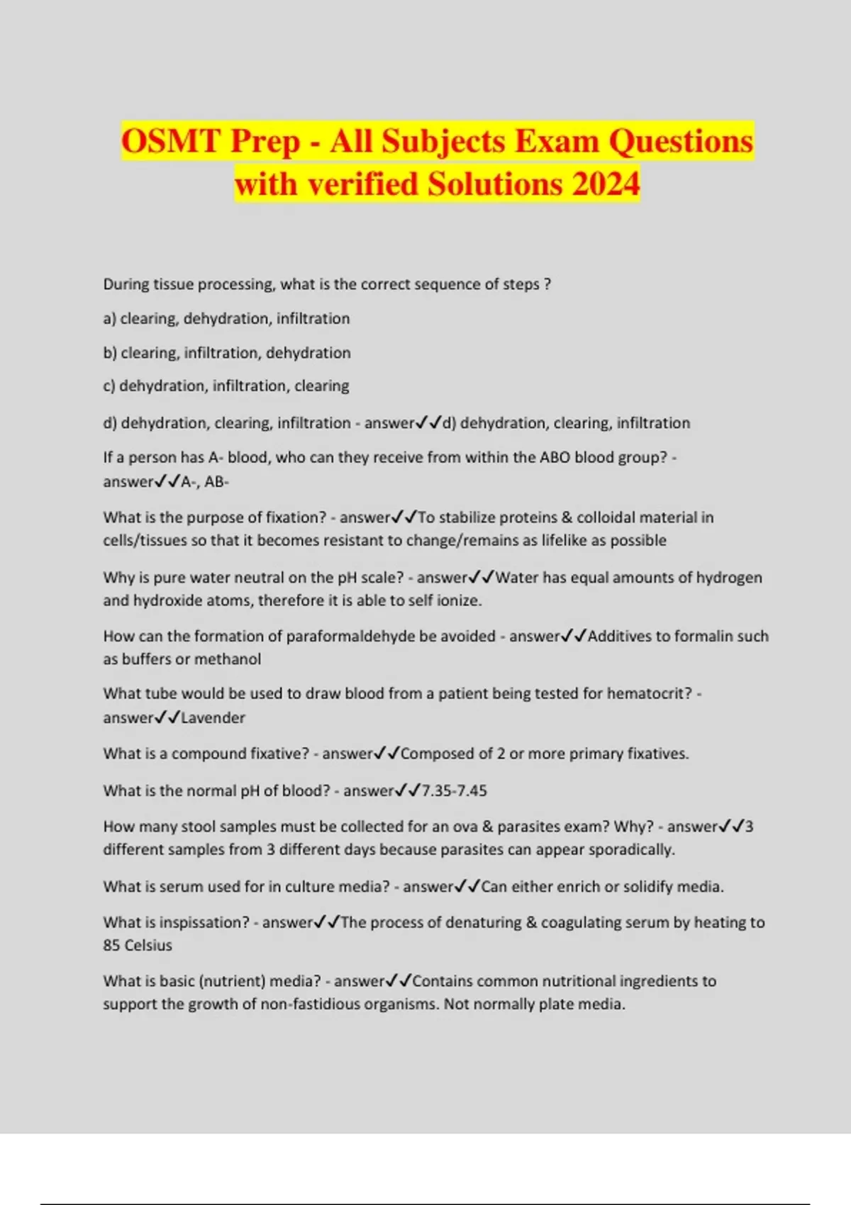OSMT Prep - All Subjects Exam Questions with verified Solutions 2024 During tissue processing, what is the correct sequence of steps ? a) clearing, dehydration, infiltration b) clearing, infiltration, dehydration c) dehydration, infiltration, clearing d) dehydration, clearing, infiltration - answerd) dehydration, clearing, infiltration If a person has A- blood, who can they receive from within the ABO blood group? - answerA-, AB- What is the purpose of fixation? - answerTo stabilize proteins & colloidal material in cells/tissues so that it becomes resistant to change/remains as lifelike as possible Why is pure water neutral on the pH scale? - answerWater has equal amounts of hydrogen and hydroxide atoms, therefore it is able to self ionize. How can the formation of paraformaldehyde be avoided - answerAdditives to formalin such as buffers or methanol What tube would be used to draw blood from a patient being tested for hematocrit? - answerLavender What is a compound fixative? - answerComposed of 2 or more primary fixatives. What is the normal pH of blood? - answer7.35-7.45 How many stool samples must be collected for an ova & parasites exam? Why? - answer3 different samples from 3 different days because parasites can appear sporadically. What is serum used for in culture media? - answerCan either enrich or solidify media. What is inspissation? - answerThe process of denaturing & coagulating serum by heating to 85 Celsius What is basic (nutrient) media? - answerContains common nutritional ingredients to support the growth of non-fastidious organisms. Not normally plate media. What primary basic ingredient provides a carbon & energy source for bacteria growth? - answerCarbohydrates (glucose) Appromixmately how much blood is in a human adult body? - answer5L What is the most common stain used for cytology testing? - answerPAP smear (Papinicolaou's staining technique) What are the four basic types of tissue? - answerEpithelial, connective, muscular, nervous A movement that takes a body part further away from it's central axis is called a(n): - answerAbduction Incomplete, partial hemolysis around bacterial colonies on a growth plate is called: a) Alpha hemolysis b) Beta hemolysis c) Gamma hemolysis - answera) Alpha hemolysis What antiseptic is used to clean the venipuncture site? - answer70% isopropyl alcohol Where are red blood cells produced in a fetus? - answerThe liver What does mean measure? - answerThe average value of numbers within a set What is a chromogen? - answerAdded to media as an indicator by changing the colour of a bacterial colony. What colour would a Gram positive be? - answerpurple-blue What is a buffer system? - answerHelps to maintain a relatively constant pH. Chemical compounds that covert strong acids and bases into weak ones. What dye is used as the primary stain when performing a Gram Stain? - answerCrystal/Gentian Violet What is a blastoconidia? - answerBuds/ 'daughter cells' of yeasts. They can extend to form a chain-like structure called pseudohyphae. What is added to MacConkey plate media to make it selective? - answerCrystal violet and bile salts inhibit the growth of gram positive bacteria What is a protozoa? - answerSingle-celled & microscopic, can infect most body sites. What is agglutination? - answerClumping/aggregation of cells as a result of a reaction with a specific antibody. Why would a sputum sample be collected? - answerTo help determine the presence of microorganisms that can cause respiratory diseases. (bronchitis, pneumonia, TB) What is the decolourizer used in the PAP stain? - answerAcid Alcohol What are the two types of cardiac cells? - answerMechanical and electrical (pacemaker) cells What type of microorganisms require live cell media? - answerViruses (they need a live host in order to multiply) What is a helminth? - answerParasitic worm that commonly infects the GI tract. Why is starch commonly found in antimicrobial sensitivity testing media? - answerAbsorbs toxic by-products of bacteria that can interfere with the growth of other bacteria/sensitivity testing. What plate media would be used to isolate gonorrhea & meningitis? - answerThayer-Martin Why is the Geimsa stain required for specimens containing potential Chlamydia bacteria? - answerChlamydia lacks a cell wall, therefore if Gram stain is performed, results will always show up as Gram negative. What is the purpose of immunoassay testing? - answerDetects low levels of antigens Why must sterile distilled water be used for culture media? - answerImpurities in non- sterile water may inhibit bacterial growth In culture media, how are bile salts used as a selective agent? - answerBile emulsifies fat, which means it will inhibit most Gram positive bacteria. Only allows for the growth of Gram negative bacteria. What is a titer? - answerA serial dilution of a liquid sample to help determine the approximate level of antibodies present in the sample. Name 4 reasons for ordering a wound culture. - answer1. failure to heal 2. signs of infection 3. discharge 4. nonrespondent to antobiotic therapy What type of bacteria require a ZN Stain? - answerMycobacterium species (acid fast bacteria)