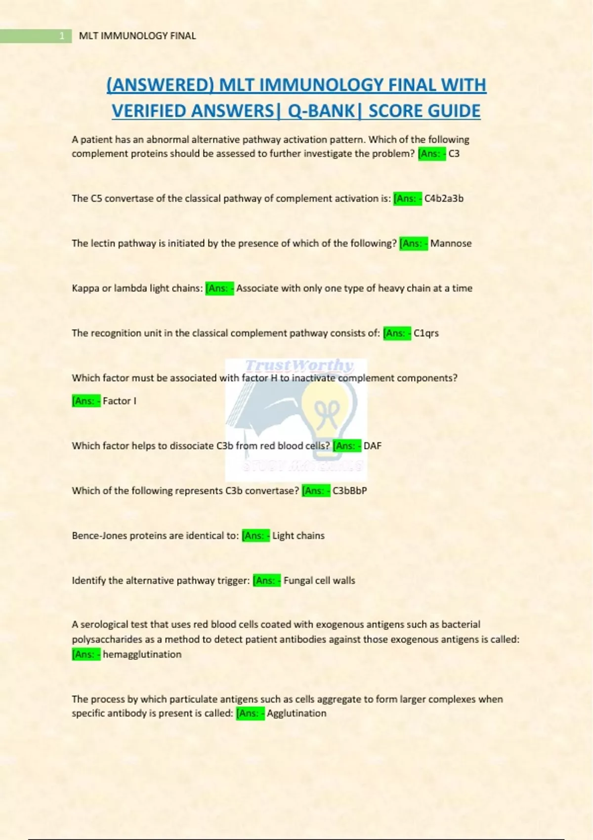 (ANSWERED) MLT IMMUNOLOGY FINAL WITH VERIFIED ANSWERS| Q-BANK| SCORE GUIDE