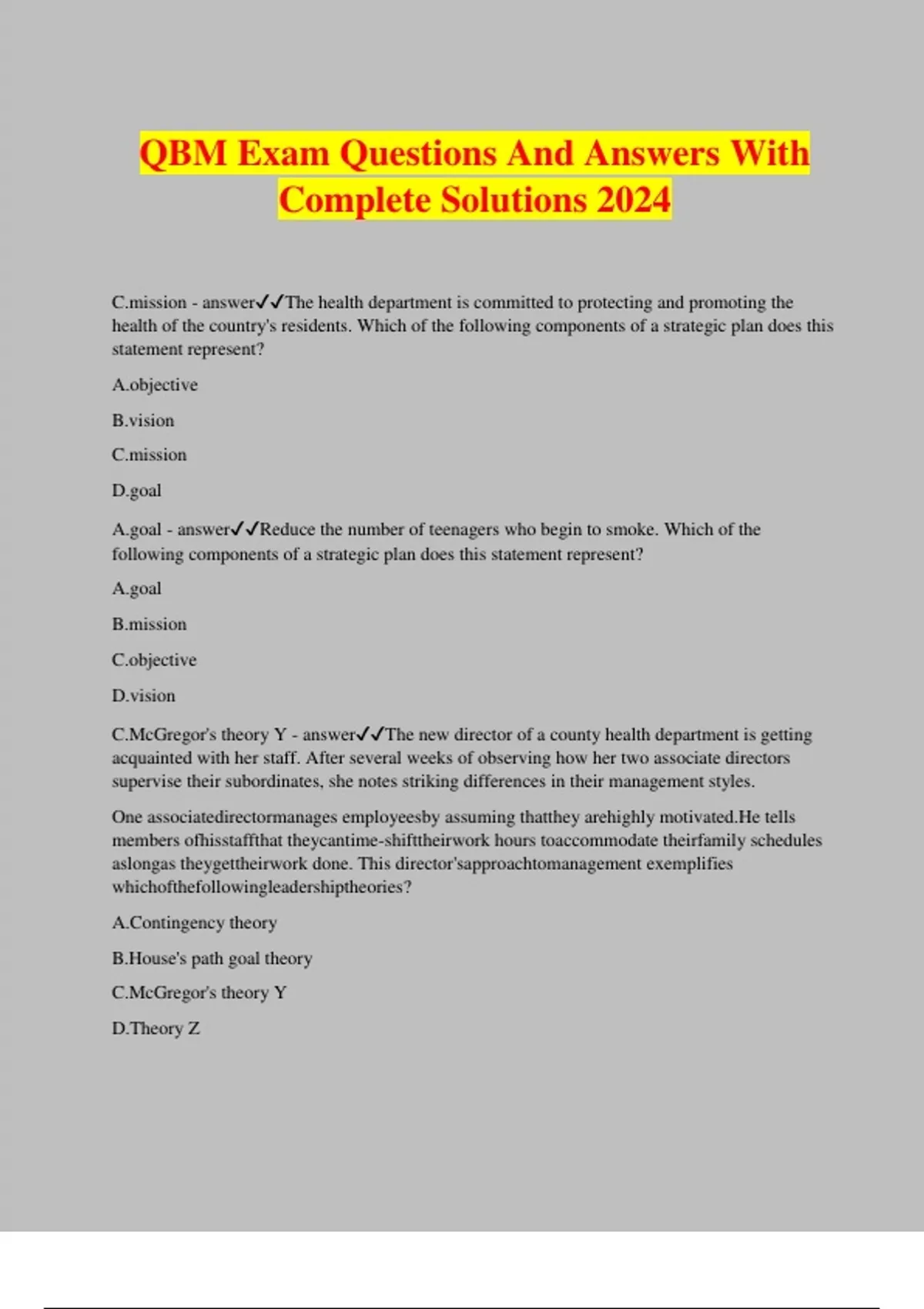 QBM Exam Questions And Answers With Complete Solutions 2024 C.mission - answerThe health department is committed to protecting and promoting the health of the country's residents. Which of the following components of a strategic plan does this statement represent? A.objective B.vision C.mission D.goal A.goal - answerReduce the number of teenagers who begin to smoke. Which of the following components of a strategic plan does this statement represent? A.goal B.mission C.objective D.vision C.McGregor's theory Y - answerThe new director of a county health department is getting acquainted with her staff. After several weeks of observing how her two associate directors supervise their subordinates, she notes striking differences in their management styles. One associatedirectormanages employeesby assuming thatthey arehighly motivated.He tells members ofhisstaffthat theycantime-shifttheirwork hours toaccommodate theirfamily schedules aslongas theygettheirwork done. This director'sapproachtomanagement exemplifies whichofthefollowingleadershiptheories? A.Contingency theory B.House's path goal theory C.McGregor's theory Y D.Theory Z A.McGregor's theory - answerThe new director of a county health department is getting acquainted with her staff. After several weeks of observing how her two associate directors supervise their subordinates, she notes striking differences in their management styles. The other associate director assumes that employees find no satisfaction in their work and are exclusively motivated by their salaries. This associate director's approach to management exemplifies which of the following leadership theories? A.McGregor's theory B.Contingency theory C.Theory Z D.House's path goal therapy D.Contingency therapy - answerThe new director of a county health department is getting acquainted with her staff. After several weeks of observing how her two associate directors supervise their subordinates, she notes striking differences in their management styles. The director wants to adopt a management strategy that will meet the needs of all personnel in her department, including the two associate directors and their diverse staffs and responsibilities.The most appropriateleadershipstyle forthisdirectorisoneinformed by which ofthe followingtheories? A.Theory Z B.McGregor's theory C.House's path to goal therapy D.Contingency therapy D.It is unlikely the estimate differs from the null value because of random variability - answerA community-based study of a program to increase physical activity is conducted, and the findings are evaluated. A small p-value with an estimate is reported. Which of the following is the best interpretation of this result? A.It is likely the estimate differs from the true value because of bias. B.It is likely the estimate differs randomly and systematically from the norm. C.It is unlikely the estimate differs from the average because of chance. D.It is unlikely the estimate differs from the null value because of random variability A. dependence between the pre-test and post-test measurements - answerA pilot study is conducted to examine whether a new drug effectively decreases cholesterol levels over a 6-week period. Twelve participants are enrolled, and serum cholesterol levels are measured before and