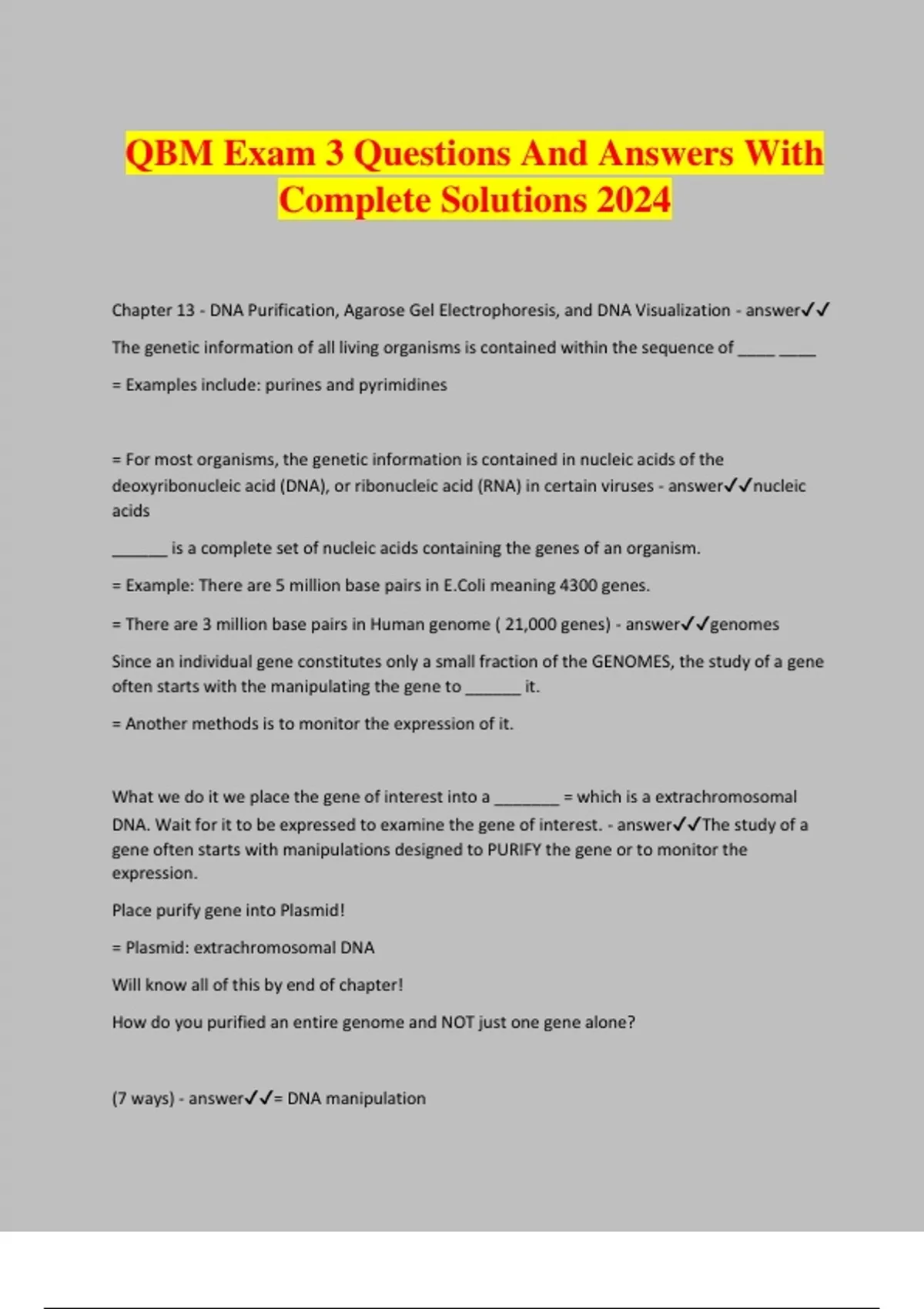 QBM Exam 3 Questions And Answers With Complete Solutions 2024 Chapter 13 - DNA Purification, Agarose Gel Electrophoresis, and DNA Visualization - answer The genetic information of all living organisms is contained within the sequence of ____ ____ = Examples include: purines and pyrimidines = For most organisms, the genetic information is contained in nucleic acids of the deoxyribonucleic acid (DNA), or ribonucleic acid (RNA) in certain viruses - answernucleic acids ______ is a complete set of nucleic acids containing the genes of an organism. = Example: There are 5 million base pairs in E.Coli meaning 4300 genes. = There are 3 million base pairs in Human genome ( 21,000 genes) - answergenomes Since an individual gene constitutes only a small fraction of the GENOMES, the study of a gene often starts with the manipulating the gene to ______ it. = Another methods is to monitor the expression of it. What we do it we place the gene of interest into a _______ = which is a extrachromosomal DNA. Wait for it to be expressed to examine the gene of interest. - answerThe study of a gene often starts with manipulations designed to PURIFY the gene or to monitor the expression. Place purify gene into Plasmid! = Plasmid: extrachromosomal DNA Will know all of this by end of chapter! How do you purified an entire genome and NOT just one gene alone? (7 ways) - answer= DNA manipulation (cloning) = Gene libraries = PCR = Hybridizations - Dot Blot - Southern Blot = RFLP, VNTR = RAPD = Sequencing Unlike proteins, DNA can survive harsh condition, buffers, and reagent. - One of the main differences is that DNA PURIFICATION can be done using _____ solvents/reagents. = Examples: NaCl Ethanol Phenol Chloroform Centrifuge - answerORGANIC REAGENTS The overview of DNA purification process is. 1. The lysis and ____ of cells 2. Removal of _______/ purifying the DNA using reagents. = In most protocols, the enzyme used in degrading DNA is _______ ___. = This enzyme can also degrade proteins as well and is active in SDS, EDTA, UREA, and wide range of pH. - answer1. Lysis / disruption of cell 2. Removal of contaminate using reagents/ organic solvents will work. = Enzymes used for purification is usually Proteinase K. There are many protocols that can be used to purified DNA. Only focus on 1. Organic solvents (Phenol-Chloroform Extraction) 2. Alkaline Lysis = Miniprep 3. Silica-based methods - selective adsorption = Know the overview of these if you must 1. Crude lysate 2. Salting-out 3. Cesium chloride gradients 4. Anion exchange - answer 1. Crude Lysate = This method is when you use ____ on the cells and then add the enzyme ____ ____. = This is not a good method because DNA will still be somewhat dirty. = This method allow ____ steps. 2. Salting-Out = This method is when you use _____ ______ to salt out the DNA, and then centrifuge it and add alcohol to precipitation the DNA. 3. Cesium Chloride Gradients = Not really mentioned in the book, but it is very difficult, time consuming, and it require the use of _____ reagents. 4. Anion exchange = The _____ of the DNA will binds to the + charged beads. Then alcohol is added to precipitated it. - answer1. Crude Lysate: Heat and then Proteinase K = Allow downstream steps. 2. Salting Out: Potassium Acetate, centrifuge, Alcohol 3. Cesium Chloride Gradients: Toxic Reagents 4. Anions Exchange: DNA negative charged backbone to + charge of beads, alcohol to precipitated. Out of Crude Lysate, Salting-Out, Cesium Chloride Gradients, and Anion exchange. Which two use alcohol for precipitation? - answerSalting Out and Anion Exchange √√√ 1. Organic Solvents = Phenol- Chloroform Extraction = In this method uses _____, ______, and ____ _____ in a ___:___:___ ratios. = The Phenol is aqueous/organic which will contain ___ and ___. = The Chloroform is aqueous/organic will contain ____ and cellular debris (scattered fragments). = The process of Phenol-Chloroform is very tedious, produces hazardous ____, contain residual organic solvents that can inhibit the downstream process of _____. - answerPhenol Chloroform isoamyl alcohol Ratio: 25:24:1 = Phenol = Upper = aqueous = DNA and RNA = Chloroform = Lower = Organic = Proteins and cellular debris. = Produce hazardous waste, residual organic solvents, and inhibit PCR. PCR= Polymerase chain reaction (PCR) is a technique used to amplify a single copy or a few copies of a piece of DNA. √√√ 2. Alkaline Lysis = This method uses _____ to break up phospholipid bilayer. = And uses ______ to dissolve structural proteins.