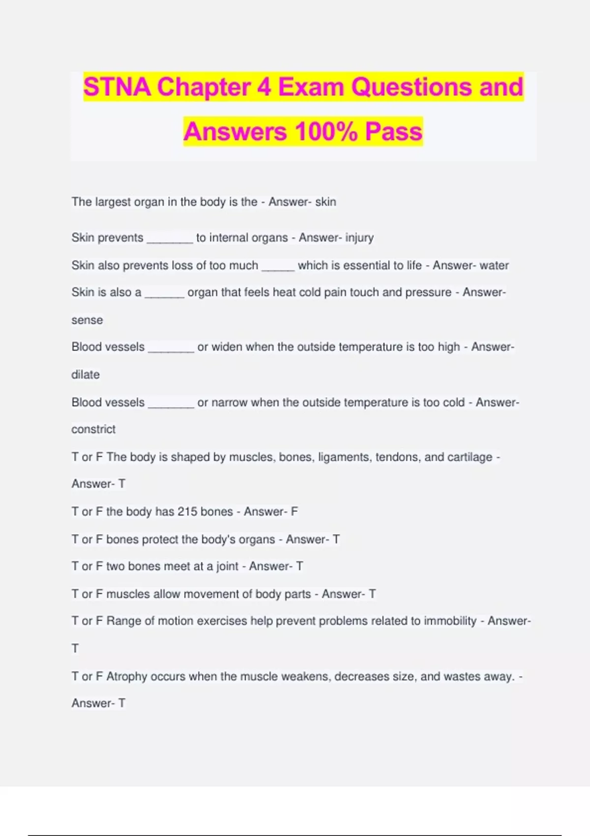 STNA Chapter 4 Exam Questions and Answers 100% Pass The largest organ in the body is the - Answer- skin Skin prevents _______ to internal organs - Answer- injury Skin also prevents loss of too much _____ which is essential to life - Answer- water Skin is also a ______ organ that feels heat cold pain touch and pressure - Answer- sense Blood vessels _______ or widen when the outside temperature is too high - Answer- dilate Blood vessels _______ or narrow when the outside temperature is too cold - Answer- constrict T or F The body is shaped by muscles, bones, ligaments, tendons, and cartilage - Answer- T T or F the body has 215 bones - Answer- F T or F bones protect the body's organs - Answer- T T or F two bones meet at a joint - Answer- T T or F muscles allow movement of body parts - Answer- T T or F Range of motion exercises help prevent problems related to immobility - Answer- T T or F Atrophy occurs when the muscle weakens, decreases size, and wastes away. - Answer- T T or F Falls can be prevented by keeping paths clear and keeping walkers or canes within easy reach - Answer- T Arthritis is a general term referring to _____ or the joints - Answer- swelling What happens with an autoimmune illness? - Answer- The immune system attacks normal tissue in the body Osteoarthritis is common in - Answer- the elderly If an NA sees NWB on a residents care plan the resident - Answer- is unable to support any weight on on or both legs Which side should residents recovering from hip replacements dress first - Answer- Affected (weaker) side Fractures are broken bones and are often caused by - Answer- Osteoporosis What kind of pillow immobilizes and positions the hips and lower extremities after a hip replacement - Answer- An abduction pillow Which of the following statements is true of a knee replacement - Answer- A knee replacement can help restore motion to the knee The nervous system - Answer- controls and coordinates. body function The two main parts of the nervous system are - Answer- Central nervous system and peripheral nervous system T or F Residents with paralysis or loss of movement do not need physical therapy - Answer- F