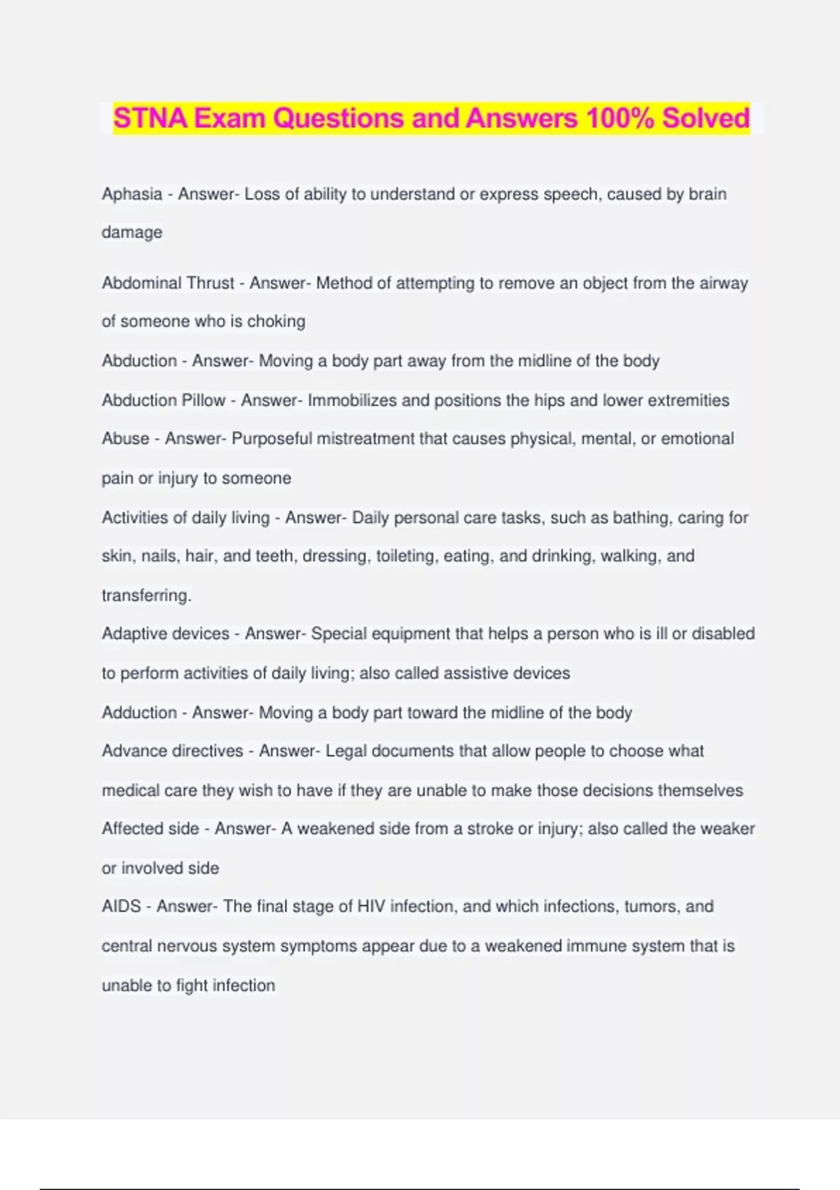 STNA Exam Questions and Answers 100% Solved Aphasia - Answer- Loss of ability to understand or express speech, caused by brain damage Abdominal Thrust - Answer- Method of attempting to remove an object from the airway of someone who is choking Abduction - Answer- Moving a body part away from the midline of the body Abduction Pillow - Answer- Immobilizes and positions the hips and lower extremities Abuse - Answer- Purposeful mistreatment that causes physical, mental, or emotional pain or injury to someone Activities of daily living - Answer- Daily personal care tasks, such as bathing, caring for skin, nails, hair, and teeth, dressing, toileting, eating, and drinking, walking, and transferring. Adaptive devices - Answer- Special equipment that helps a person who is ill or disabled to perform activities of daily living; also called assistive devices Adduction - Answer- Moving a body part toward the midline of the body Advance directives - Answer- Legal documents that allow people to choose what medical care they wish to have if they are unable to make those decisions themselves Affected side - Answer- A weakened side from a stroke or injury; also called the weaker or involved side AIDS - Answer- The final stage of HIV infection, and which infections, tumors, and central nervous system symptoms appear due to a weakened immune system that is unable to fight infection Active assisted range of motion - Answer- Exercises to put a joint through its full arc of motion that are performed by a person with some help from the affected person Acute care - Answer- 24-hour skilled care for short-term illnesses or injuries; generally given in hospitals and ambulatory surgical centers Acute illness - Answer- An illness that has severe symptoms, is treated immediately, and is usually short-term Agitated - Answer- The state of being excited, restless, or troubled Alzheimer's - Answer- A progressive, incurable disease that causes tangled nerve fibers and protein deposits to form in the brain, which eventually cause dementia Ambulation - Answer- Walking Angina pectoris - Answer- Chest pain, pressure, or discomfort Apical pulse - Answer- The pulse located on the left side of the chest, just below the nipple Apnea - Answer- The absence of breathing Aspiration - Answer- The inhalation of food, drink, or foreign material into the lungs Arthritis - Answer- A general term that refers to inflammation of the joints, causing stiffness, pain, and decreased mobility Assault - Answer- A threat to harm a person, resulting in the person feeling fearful that he or she will be harmed Assisted Living - Answer- Residences for people who do not need skilled, 24 hour care, but do require some help with daily care Assistive devices - Answer- Special equipment that helps a person who is ill or disabled to perform activities of daily living, also called adaptive devices Atherosclerosis - Answer- A hardening and narrowing of the blood vessels Atrophy - Answer- The wasting away, decreasing in size, and weakening of muscles from lack of use Axillary temperature - Answer- Temperature taken in armpit Bargaining - Answer- A stage of grief in which someone begins to believe they are dying and bargains for their recovery Battery - Answer- The intentional touching of a person without his or her consent Bed cradle - Answer- Used to keep the bed covers from resting on residents' legs and feet Bloodborne pathogens - Answer- Microorganisms found in human body, bloody fluid, draining wounds, and mucous membranes that can cause infection and disease in humans Bloodborne pathogens standard - Answer- Federal law that requires that Healthcare facilities protect employees from blood-borne health hazards Body mechanics - Answer- The way the parts of the body work together when a person moves Bony prominences - Answer- Areas of the body where bone lies close to the skin Brachial pulse - Answer- The pulse located inside the elbow, about one to one and a half inches above the elbow Bronchiectasis - Answer- Condition in which the bronchial tubes are permanently enlarged, causing chronic coughing and thick sputum Bronchitis - Answer- An irritation and inflammation of the lining of the bronch