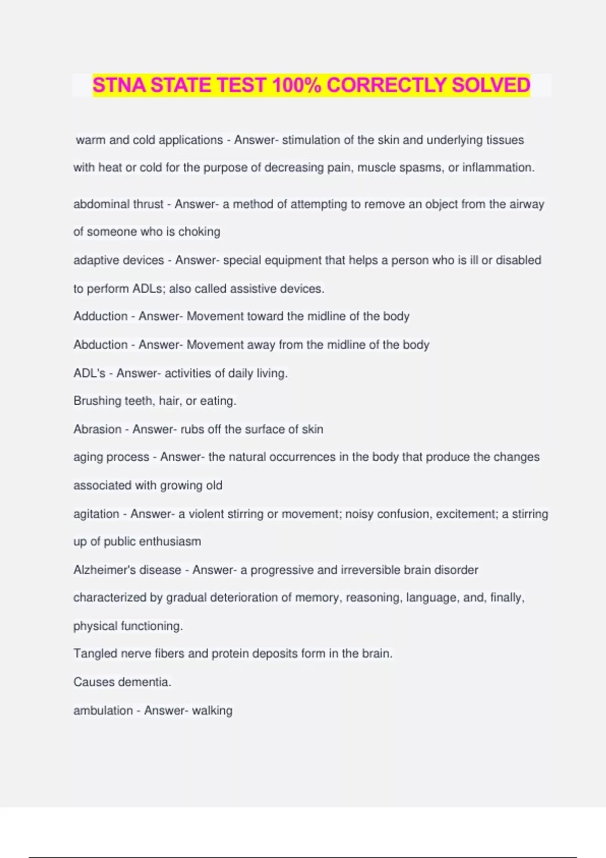 STNA STATE TEST 100% CORRECTLY SOLVED warm and cold applications - Answer- stimulation of the skin and underlying tissues with heat or cold for the purpose of decreasing pain, muscle spasms, or inflammation. abdominal thrust - Answer- a method of attempting to remove an object from the airway of someone who is choking adaptive devices - Answer- special equipment that helps a person who is ill or disabled to perform ADLs; also called assistive devices. Adduction - Answer- Movement toward the midline of the body Abduction - Answer- Movement away from the midline of the body ADL's - Answer- activities of daily living. Brushing teeth, hair, or eating. Abrasion - Answer- rubs off the surface of skin aging process - Answer- the natural occurrences in the body that produce the changes associated with growing old agitation - Answer- a violent stirring or movement; noisy confusion, excitement; a stirring up of public enthusiasm Alzheimer's disease - Answer- a progressive and irreversible brain disorder characterized by gradual deterioration of memory, reasoning, language, and, finally, physical functioning. Tangled nerve fibers and protein deposits form in the brain. Causes dementia. ambulation - Answer- walking angina pectoris - Answer- chest pain, pressure, or discomfort. Symptom of CAD. Anti-embolic stockings - Answer- fights blood clot formation Aphasia - Answer- inability to speak through speech, writing, or signs because of a brain dysfunction. acute care - Answer- 24-hour skilled care for short-term illnesses or injuries; generally given in hospitals and ambulatory surgical centers F.A.S.T - Answer- Face, Arm, Speech, Time receptive aphasia - Answer- inability to understand spoken or written words expressive aphasia - Answer- slurred speech or inability to speak autoimmune illness - Answer- an illness in which the body's immune system attacks normal tissue in the body apathy - Answer- lack of interest or emotion Ageism - Answer- prejudice or discrimination on the basis of a person's age apnea - Answer- absence of breathing arthritis - Answer- inflammation of a joint RA(rheumatoid arthritis) - Answer- Can affect anyone at any age. Autoimmune disease. Joints become red, swollen, and painful. OA(osteoarthritis) - Answer- Also called DJD (degenerative joint disease), affects the elderly. Happens with aging or injury. Can be treated. aseptic - Answer- free from disease-causing microorganisms aspiration - Answer- Breathing fluid, food, vomitus, or an object into the lungs assistive devices - Answer- parallel bars, walkers, axillary crutches, lofstrand crutches, canes bed cradle - Answer- a frame used to prevent bedclothes from touching all or part of a person's body. bedpan - Answer- vessel for receiving the urinary and fecal discharges of a patient unable to leave his or her bed Bed fracture pan - Answer- More shallow than a bedpan to help those who can't lift their hips behavioral care plan - Answer- a detailed method worked out in advance for the attainment of a goal bradycadia - Answer- heart rate is lower than 60 bpm bradypnea - Answer- A respiratory rate less than 12 breaths/min blood pressure - Answer- BP- 120/80