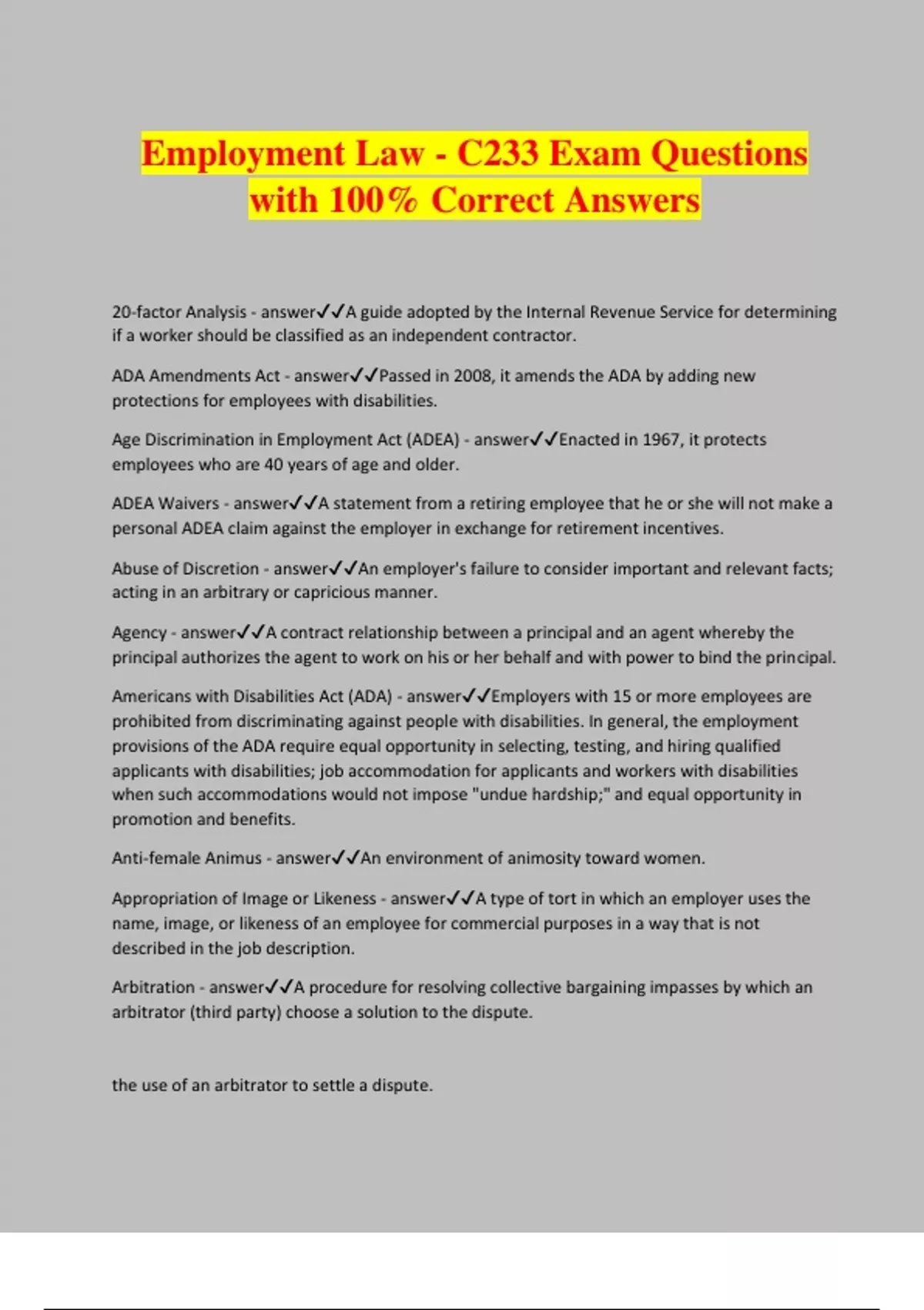 Employment Law - C233 Exam Questions with 100% Correct Answers 20-factor Analysis - answerA guide adopted by the Internal Revenue Service for determining if a worker should be classified as an independent contractor. ADA Amendments Act - answerPassed in 2008, it amends the ADA by adding new protections for employees with disabilities. Age Discrimination in Employment Act (ADEA) - answerEnacted in 1967, it protects employees who are 40 years of age and older. ADEA Waivers - answerA statement from a retiring employee that he or she will not make a personal ADEA claim against the employer in exchange for retirement incentives. Abuse of Discretion - answerAn employer's failure to consider important and relevant facts; acting in an arbitrary or capricious manner. Agency - answerA contract relationship between a principal and an agent whereby the principal authorizes the agent to work on his or her behalf and with power to bind the principal. Americans with Disabilities Act (ADA) - answerEmployers with 15 or more employees are prohibited from discriminating against people with disabilities. In general, the employment provisions of the ADA require equal opportunity in selecting, testing, and hiring qualified applicants with disabilities; job accommodation for applicants and workers with disabilities when such accommodations would not impose "undue hardship;" and equal opportunity in promotion and benefits. Anti-female Animus - answerAn environment of animosity toward women. Appropriation of Image or Likeness - answerA type of tort in which an employer uses the name, image, or likeness of an employee for commercial purposes in a way that is not described in the job description. Arbitration - answerA procedure for resolving collective bargaining impasses by which an arbitrator (third party) choose a solution to the dispute. the use of an arbitrator to settle a dispute. Impasses - answera situation in which no progress is possible, especially because of disagreement; a deadend. Assumption of the Risk - answerAn employer defense that states an employee knows and accepts the risk of potential injury in a certain position. Bona Fide Occupational Qualification (BFOQ) - answer(Bona Fide Occupational Qualification) Job requirement that an employee be a particular religion, sex, or national origin that is reasonably necessary to business operations. For instance, it is assumed that an opening for a Baptist minister at a local Baptist church would be filled by a minister who is actually a person who celebrates the Baptist religion and not, say, the Episcopal religion. Case Law - answerThe law as laid down in the decisions of the courts (distinct from statutes or other sources of law). Civil Law - answerLaws that deal with the rights of people rather than with crimes. Civil Rights Act of 1964 (Title VII) - answermakes it unlawful to discriminate against someone on the basis of race, color, national origin, sex (including pregnancy, sexual orientation, and gender identity) or religion. Clayton Act - answerEnacted in 1914, it prohibits the elimination of unions. Closed Union Shop - answerAn illegal requirement that an employee be a union member. (Taft-Hartley) The Labor Management Relations Act of 1947 (The Taft-Hartley Act) - answerEnacted in 1947, it curbs union overreaching by protecting employee rights and prohibiting wildcat strikes. Amended the NLRA to protect a worker's right not to engage in concerted activity and outlined the unfair labor practices in which a union could engage. Wildcat strike - answerStrike action undertaken by unionised workers without union leadership's authorisation, support, or approval; this is sometimes termed an unofficial industrial action. Color - answerSkin pigmentation characteristic of race, especially other than White. Common Law - answerPrinciples developed over centuries as a result of legal decisions made by judges in individual cases. Body of unwritten laws based on legal precedents established by the courts. Common law influences the decision-making process in unusual cases where the outcome cannot be determined based on existing statutes or written rules of law. Common Law Agency - answerA test that classifies a worker as an employee if the employer maintains the right to control the method of work performed. For example, a worker classified as an independent contractor, but who must conform to strict standards of work hours, grooming, dress, billing processes, reporting procedures, and so on, is really an employee. Common Law Criminal Conspiracy - answerA combination of two or more individuals planning to accomplish an unlawful purpose. Businesses claimed that workers organizing together to influence wages, prices, and trade was unlawful and, therefore, organizers were guilty of conspiracy. (anti-union efforts) Community of Interests - answerA community of people who align themselves with a common interest. Unions form when workers with a community of interests align themselves to resolve similar workplace concerns. Comparable Worth Theory - answerThe notion that men and women should receive equal pay when they perform work that requires comparable skills and responsibilities. Comparative Evidence - answerEvidence of discrimination that is found by comparing two similarly situated employees who were treated differently because of a class characteristic (such as race) Compensatory Time - answerAn option for public employers to allow time off for employees instead of payment. Concerted Activity - answerAny effort by employees to join together to seek improvement in working conditions. Conciliation - answerProcess where a third party acts as an intermediary between the parties to a labor dispute, helping them to reach a settlement. Conglomerate - answerA highly diversified firm that has multiple businesses with no relationships.