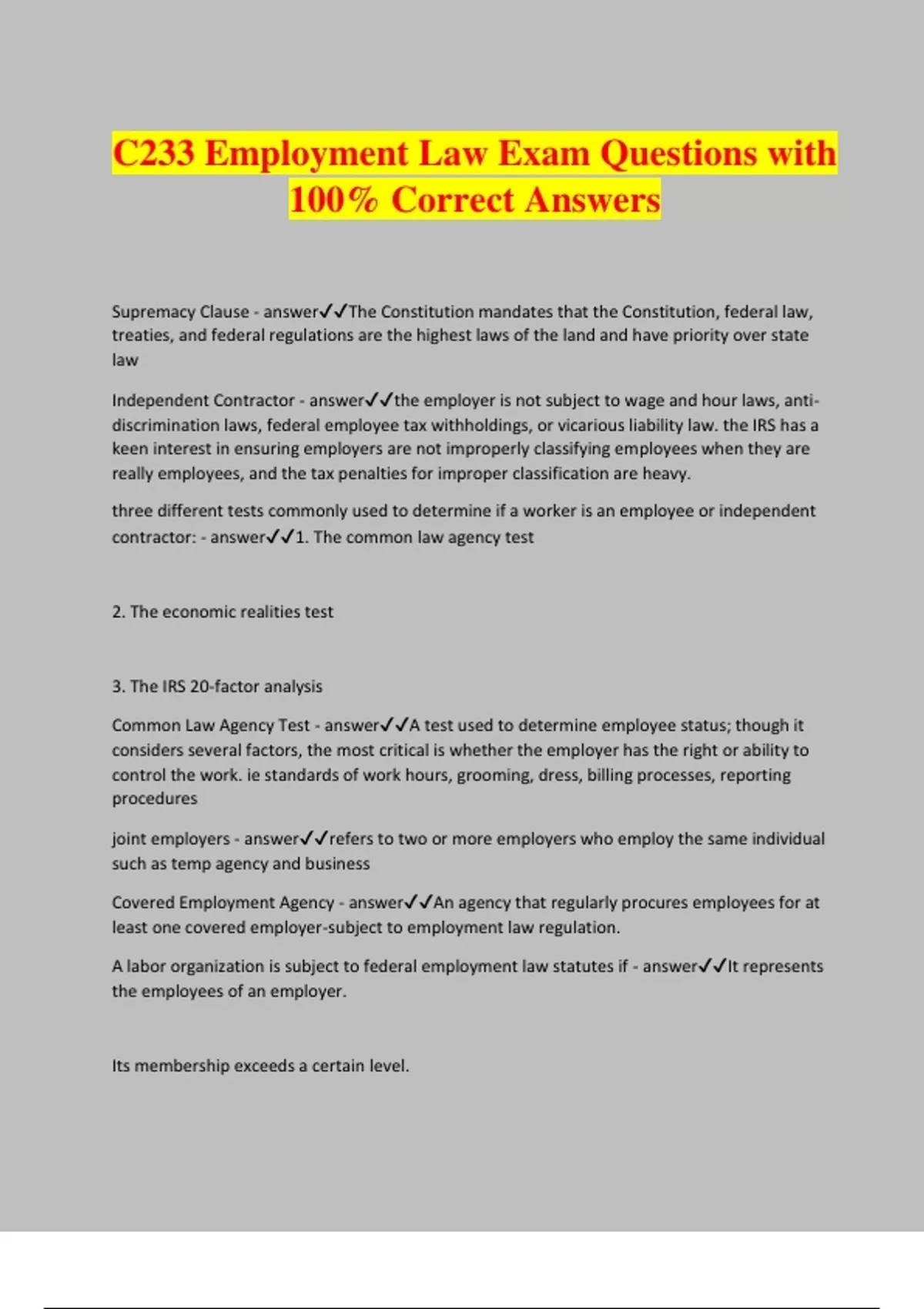 C233 Employment Law Exam Questions with 100% Correct Answers