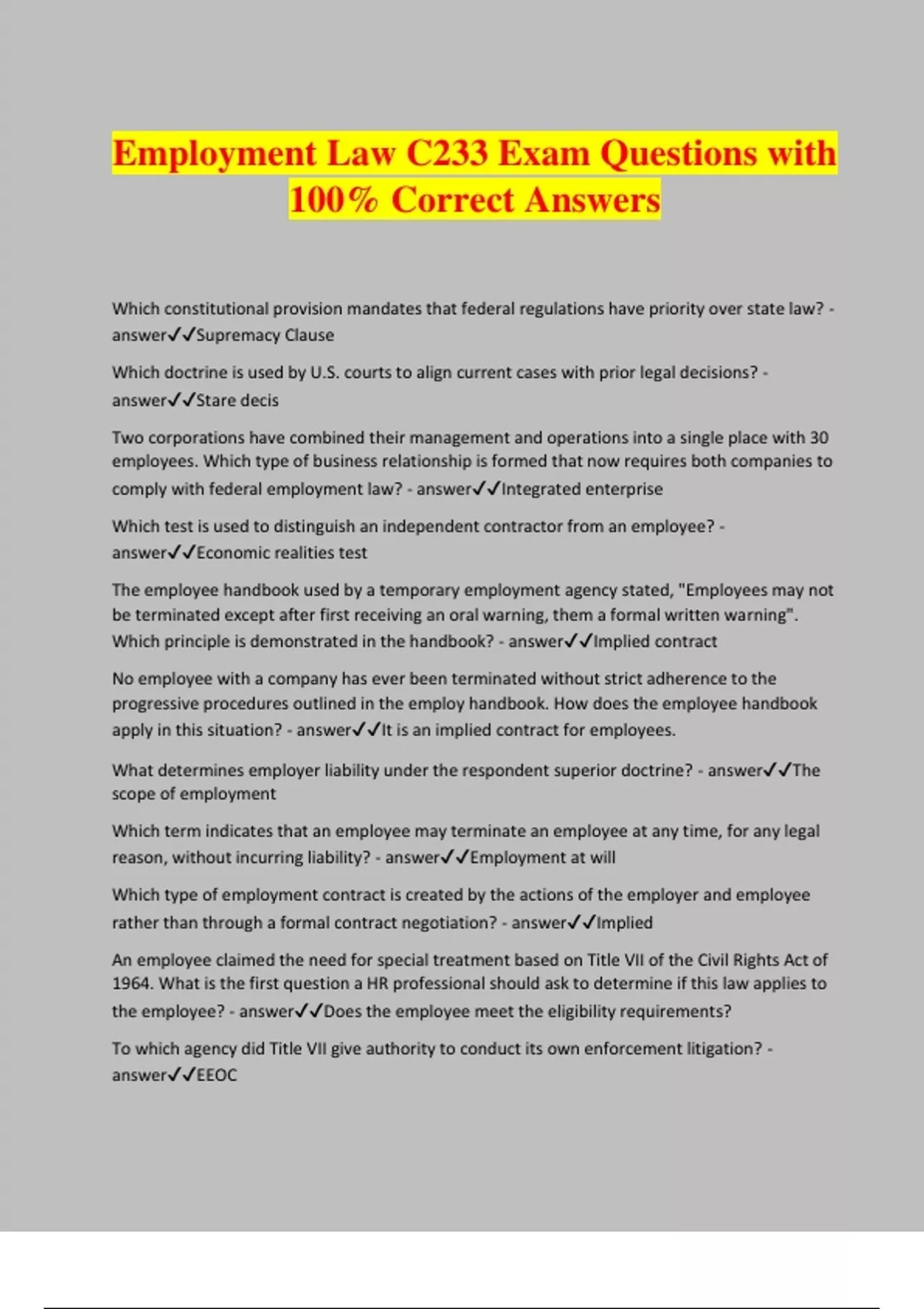 Employment Law C233 Exam Questions with 100% Correct Answers Which constitutional provision mandates that federal regulations have priority over state law? - answerSupremacy Clause Which doctrine is used by U.S. courts to align current cases with prior legal decisions? - answerStare decis Two corporations have combined their management and operations into a single place with 30 employees. Which type of business relationship is formed that now requires both companies to comply with federal employment law? - answerIntegrated enterprise Which test is used to distinguish an independent contractor from an employee? - answerEconomic realities test The employee handbook used by a temporary employment agency stated, "Employees may not be terminated except after first receiving an oral warning, them a formal written warning". Which principle is demonstrated in the handbook? - answerImplied contract No employee with a company has ever been terminated without strict adherence to the progressive procedures outlined in the employ handbook. How does the employee handbook apply in this situation? - answerIt is an implied contract for employees. What determines employer liability under the respondent superior doctrine? - answerThe scope of employment Which term indicates that an employee may terminate an employee at any time, for any legal reason, without incurring liability? - answerEmployment at will Which type of employment contract is created by the actions of the employer and employee rather than through a formal contract negotiation? - answerImplied An employee claimed the need for special treatment based on Title VII of the Civil Rights Act of 1964. What is the first question a HR professional should ask to determine if this law applies to the employee? - answerDoes the employee meet the eligibility requirements? To which agency did Title VII give authority to conduct its own enforcement litigation? - answerEEOC