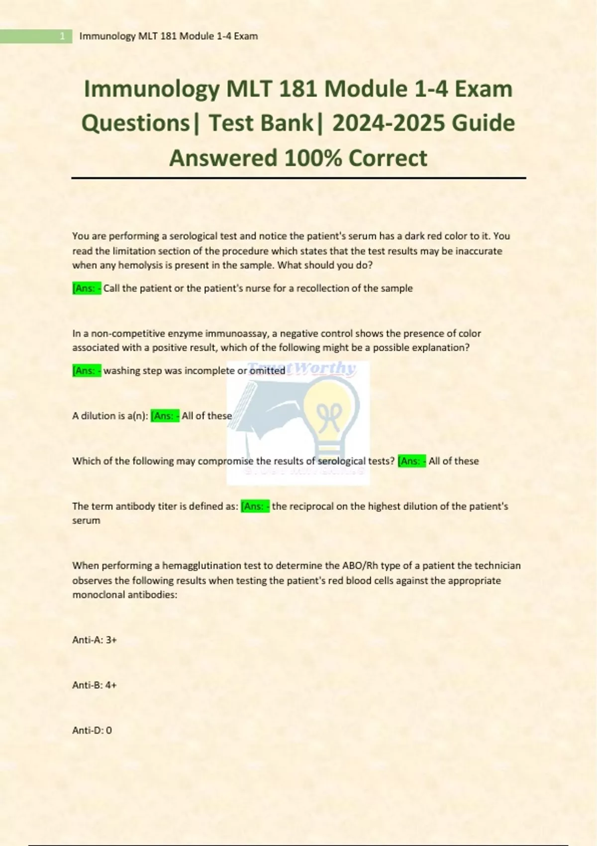 Immunology MLT 181 Module 1-4 Exam Questions| Test Bank| Guide Answered 100% Correct