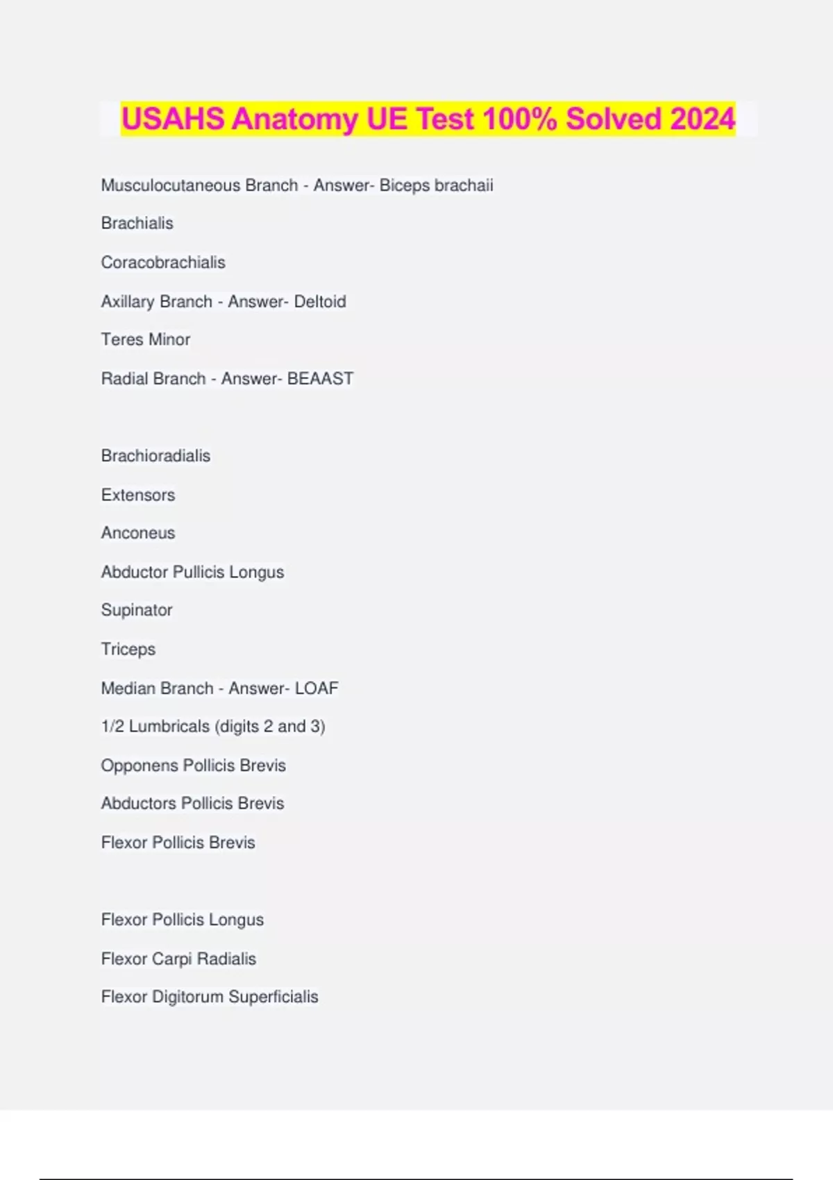 USAHS Anatomy UE Test 100% Solved 2024