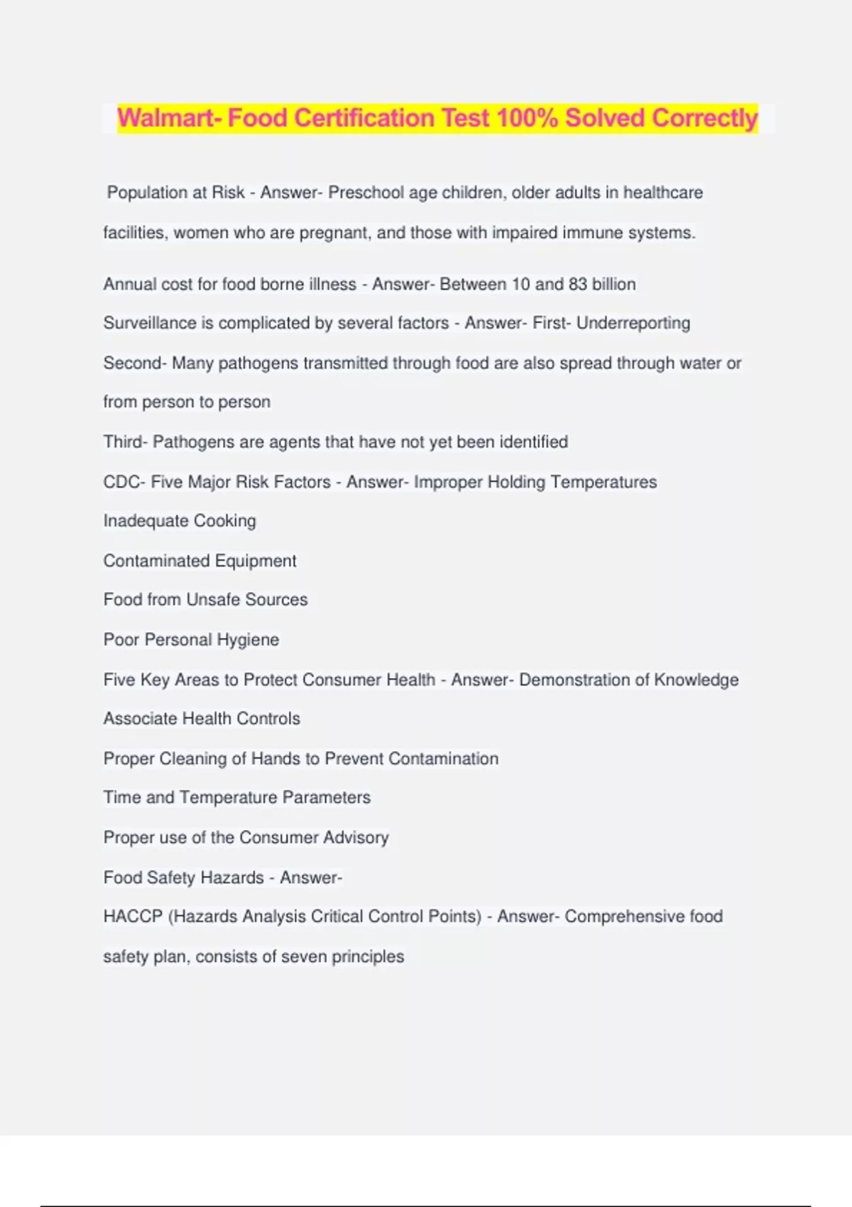 Walmart- Food Certification Test 100% Solved Correctly Population at Risk - Answer- Preschool age children, older adults in healthcare facilities, women who are pregnant, and those with impaired immune systems. Annual cost for food borne illness - Answer- Between 10 and 83 billion Surveillance is complicated by several factors - Answer- First- Underreporting Second- Many pathogens transmitted through food are also spread through water or from person to person Third- Pathogens are agents that have not yet been identified CDC- Five Major Risk Factors - Answer- Improper Holding Temperatures Inadequate Cooking Contaminated Equipment Food from Unsafe Sources Poor Personal Hygiene Five Key Areas to Protect Consumer Health - Answer- Demonstration of Knowledge Associate Health Controls Proper Cleaning of Hands to Prevent Contamination Time and Temperature Parameters Proper use of the Consumer Advisory Food Safety Hazards - Answer- HACCP (Hazards Analysis Critical Control Points) - Answer- Comprehensive food safety plan, consists of seven principles Principle 1 - Answer- Conduct a hazard analysis, provides blueprint of the overall operation Principle 2 - Answer- Determine critical control points (CCPs), examples are in the cooking processes and chilling processes Principle 3 - Answer- Establish Critical Limits, for each CCP there needs to be a measurable limit that must be met, internal cooking temperature for chicken is 165 Principle 4 - Answer- Establish Monitoring Procedures, make sure the limits are consistently met Principle 5 - Answer- Establish Corrective Action, if and then plan is established Principle 6 - Answer- Establish Verification Procedures Principle 7 - Answer- Establish Record Keeping in Procedures Biological Hazards - Answer- Bacterial, Viral, and Parasitic Microorganisms Bacteria - Answer- Although cooking destroys foodborne bacteria to acceptable levels, certain bacteria, can form spores that survive cooking and may grow if food is not properly cooled or held after cooking. Spores that are created cannot be destroyed with reheating. Salmonella and Campylobacter is a major concern Virus - Answer- Small infectious agent that can replicate only inside the living cells of organisms. Most likely agents are water, produce, shellfish, and other ready to eat foods Parasites - Answer- Associated with undercooking meat products or cross- contamination of ready to eat food with raw animal food, untreated water, or contaminated equipment or utensils