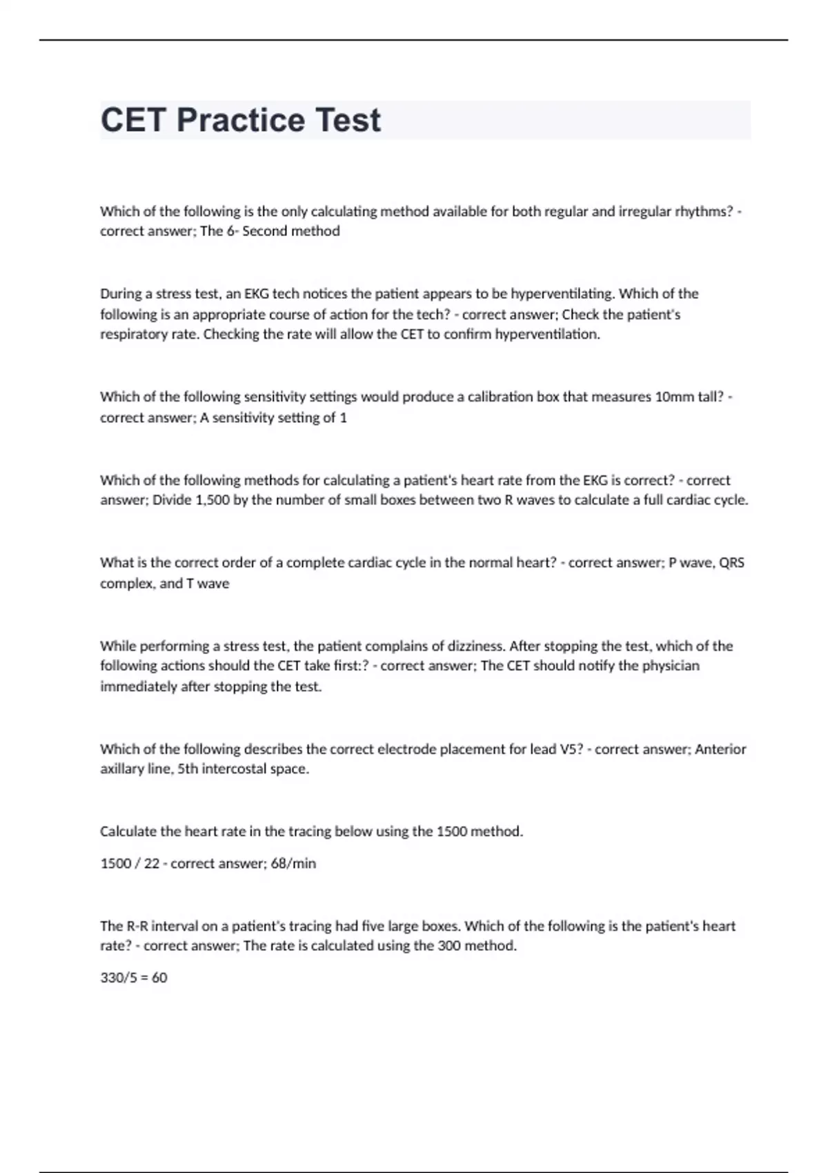 Which of the following is the only calculating method available for both regular and irregular rhythms? - correct answer; The 6- Second method During a stress test, an EKG tech notices the patient appears to be hyperventilating. Which of the following is an appropriate course of action for the tech? - correct answer; Check the patient's respiratory rate. Checking the rate will allow the CET to confirm hyperventilation. Which of the following sensitivity settings would produce a calibration box that measures 10mm tall? - correct answer; A sensitivity setting of 1 Which of the following methods for calculating a patient's heart rate from the EKG is correct? - correct answer; Divide 1,500 by the number of small boxes between two R waves to calculate a full cardiac cycle. What is the correct order of a complete cardiac cycle in the normal heart? - correct answer; P wave, QRS complex, and T wave While performing a stress test, the patient complains of dizziness. After stopping the test, which of the following actions should the CET take first:? - correct answer; The CET should notify the physician immediately after stopping the test. Which of the following describes the correct electrode placement for lead V5? - correct answer; Anterior axillary line, 5th intercostal space. Calculate the heart rate in the tracing below using the 1500 method. 1500 / 22 - correct answer; 68/min The R-R interval on a patient's tracing had five large boxes. Which of the following is the patient's heart rate? - correct answer; The rate is calculated using the 300 method. 330/5 = 60
