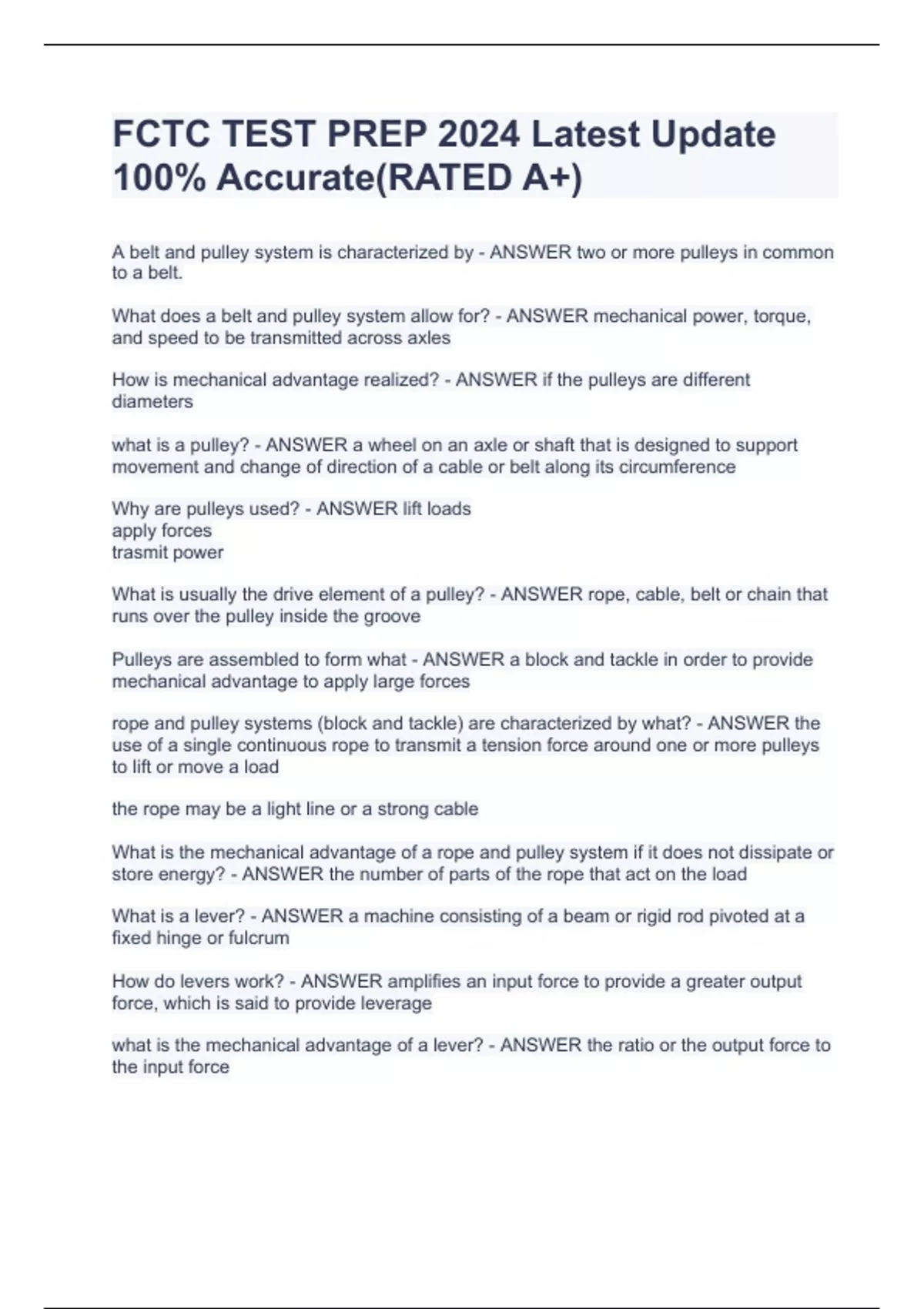 A belt and pulley system is characterized by - ANSWER two or more pulleys in common to a belt. What does a belt and pulley system allow for? - ANSWER mechanical power, torque, and speed to be transmitted across axles How is mechanical advantage realized? - ANSWER if the pulleys are different diameters what is a pulley? - ANSWER a wheel on an axle or shaft that is designed to support movement and change of direction of a cable or belt along its circumference Why are pulleys used? - ANSWER lift loads apply forces trasmit power What is usually the drive element of a pulley? - ANSWER rope, cable, belt or chain that runs over the pulley inside the groove Pulleys are assembled to form what - ANSWER a block and tackle in order to provide mechanical advantage to apply large forces rope and pulley systems (block and tackle) are characterized by what? - ANSWER the use of a single continuous rope to transmit a tension force around one or more pulleys to lift or move a load the rope may be a light line or a strong cable What is the mechanical advantage of a rope and pulley system if it does not dissipate or store energy? - ANSWER the number of parts of the rope that act on the load What is a lever? - ANSWER a machine consisting of a beam or rigid rod pivoted at a fixed hinge or fulcrum How do levers work? - ANSWER amplifies an input force to provide a greater output force, which is said to provide leverage what is the mechanical advantage of a lever? - ANSWER the ratio or the output force to the input force How are levers classified? - ANSWER by relative positions of the fulcrum and the input and output forces. allows identification by the relative locations of the fulcrum, the resistance, and the effort. Class 1 Lever - ANSWER Fulcrum in the middle the effort is applied on one side of the fulcrum and the resistance on the other side. Examples of Class 1 levers: - ANSWER see saw, crowbar, scissors What is the mechanical advantage of a Class 1 lever? - ANSWER It may be greater than or less than 1