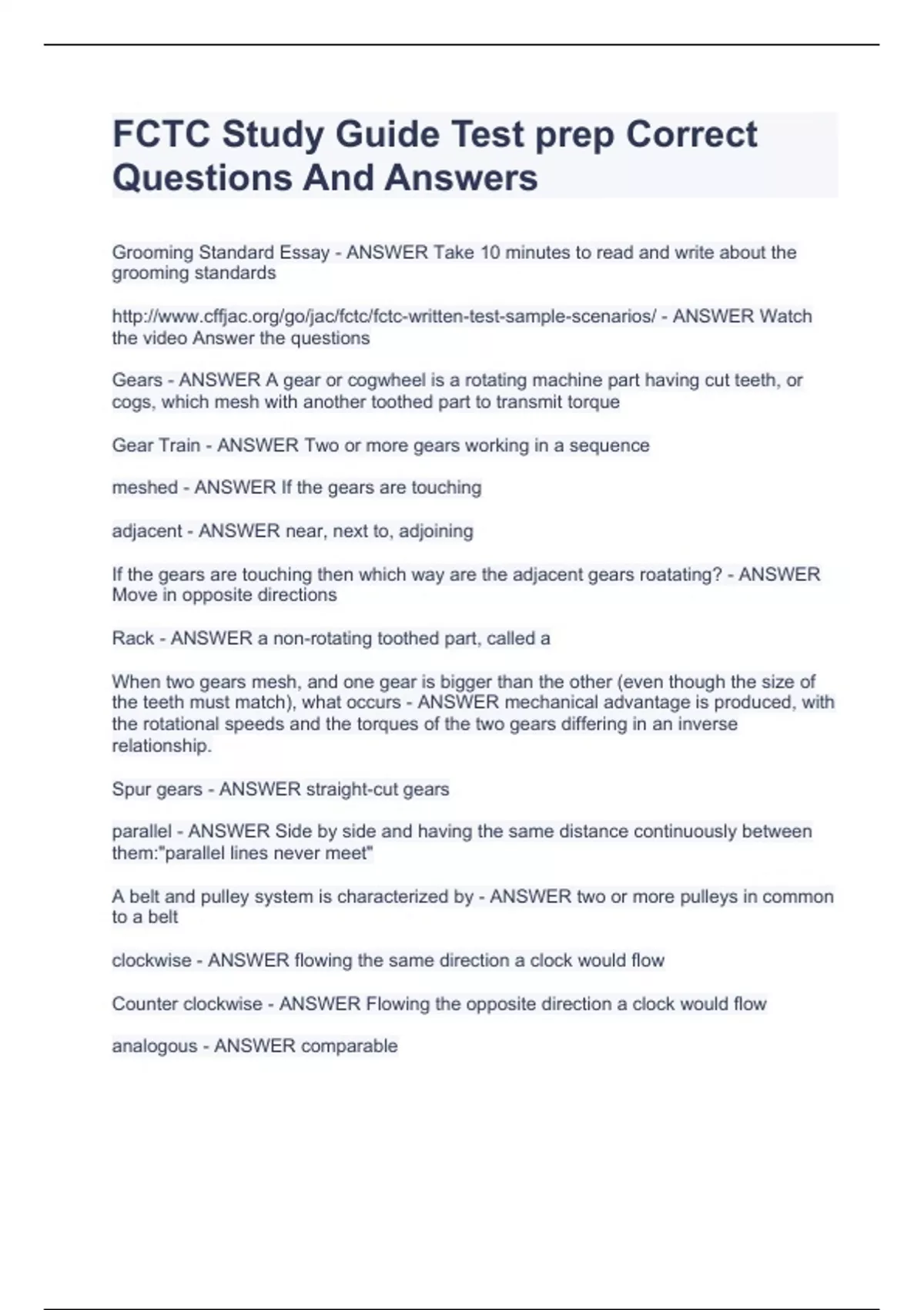 Grooming Standard Essay - ANSWER Take 10 minutes to read and write about the grooming standards Gears - ANSWER A gear or cogwheel is a rotating machine part having cut teeth, or cogs, which mesh with another toothed part to transmit torque Gear Train - ANSWER Two or more gears working in a sequence meshed - ANSWER If the gears are touching adjacent - ANSWER near, next to, adjoining If the gears are touching then which way are the adjacent gears roatating? - ANSWER Move in opposite directions Rack - ANSWER a non-rotating toothed part, called a When two gears mesh, and one gear is bigger than the other (even though the size of the teeth must match), what occurs - ANSWER mechanical advantage is produced, with the rotational speeds and the torques of the two gears differing in an inverse relationship. Spur gears - ANSWER straight-cut gears parallel - ANSWER Side by side and having the same distance continuously between them:"parallel lines never meet" A belt and pulley system is characterized by - ANSWER two or more pulleys in common to a belt clockwise - ANSWER flowing the same direction a clock would flow Counter clockwise - ANSWER Flowing the opposite direction a clock would flow analogous - ANSWER comparable flanges - ANSWER an edge that sticks out used to strengthen an object by holding it in place or attaching it to another object rope and pulley system - ANSWER is characterized by the use of a single continuous