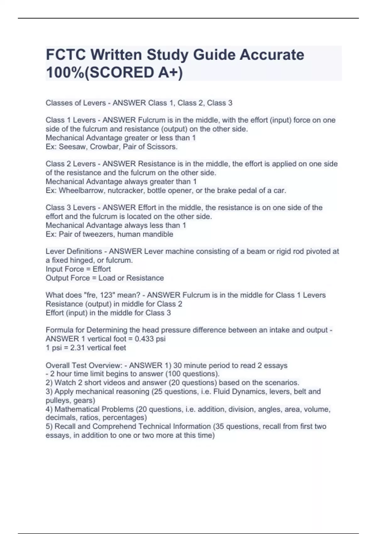 Classes of Levers - ANSWER Class 1, Class 2, Class 3 Class 1 Levers - ANSWER Fulcrum is in the middle, with the effort (input) force on one side of the fulcrum and resistance (output) on the other side. Mechanical Advantage greater or less than 1 Ex: Seesaw, Crowbar, Pair of Scissors. Class 2 Levers - ANSWER Resistance is in the middle, the effort is applied on one side of the resistance and the fulcrum on the other side. Mechanical Advantage always greater than 1 Ex: Wheelbarrow, nutcracker, bottle opener, or the brake pedal of a car. Class 3 Levers - ANSWER Effort in the middle, the resistance is on one side of the effort and the fulcrum is located on the other side. Mechanical Advantage always less than 1 Ex: Pair of tweezers, human mandible Lever Definitions - ANSWER Lever machine consisting of a beam or rigid rod pivoted at a fixed hinged, or fulcrum. Input Force = Effort Output Force = Load or Resistance What does "fre, 123" mean? - ANSWER Fulcrum is in the middle for Class 1 Levers Resistance (output) in middle for Class 2 Effort (input) in the middle for Class 3 Formula for Determining the head pressure difference between an intake and output - ANSWER 1 vertical foot = 0.433 psi 1 psi = 2.31 vertical feet Overall Test Overview: - ANSWER 1) 30 minute period to read 2 essays - 2 hour time limit begins to answer (100 questions). 2) Watch 2 short videos and answer (20 questions) based on the scenarios. 3) Apply mechanical reasoning (25 questions, i.e. Fluid Dynamics, levers, belt and pulleys, gears) 4) Mathematical Problems (20 questions, i.e. addition, division, angles, area, volume, decimals, ratios, percentages) 5) Recall and Comprehend Technical Information (35 questions, recall from first two essays, in addition to one or two more at this time)