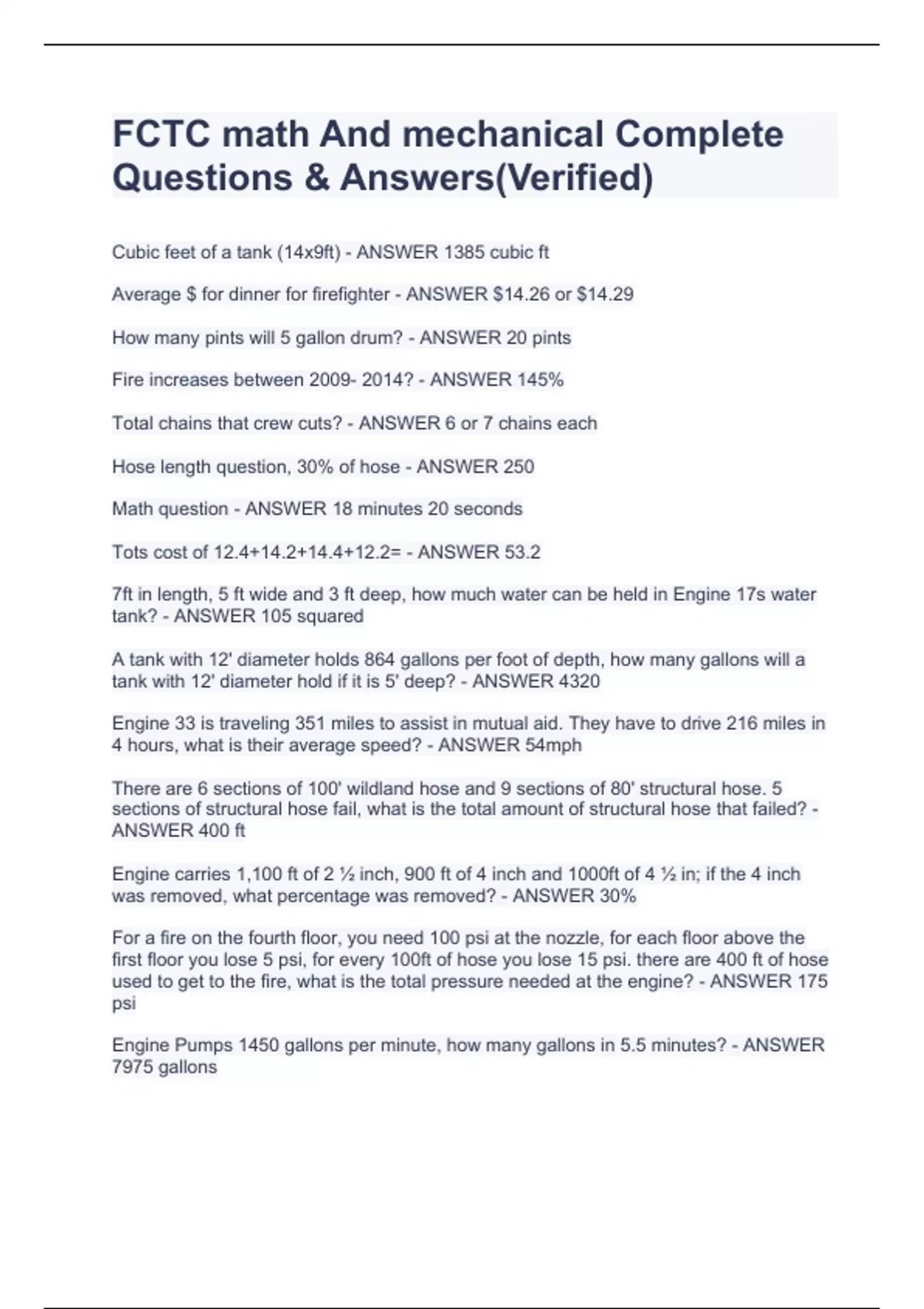 Cubic feet of a tank (14x9ft) - ANSWER 1385 cubic ft Average $ for dinner for firefighter - ANSWER $14.26 or $14.29 How many pints will 5 gallon drum? - ANSWER 20 pints Fire increases between ? - ANSWER 145% Total chains that crew cuts? - ANSWER 6 or 7 chains each Hose length question, 30% of hose - ANSWER 250 Math question - ANSWER 18 minutes 20 seconds Tots cost of 12.4+14.2+14.4+12.2= - ANSWER 53.2 7ft in length, 5 ft wide and 3 ft deep, how much water can be held in Engine 17s water tank? - ANSWER 105 squared A tank with 12' diameter holds 864 gallons per foot of depth, how many gallons will a tank with 12' diameter hold if it is 5' deep? - ANSWER 4320 Engine 33 is traveling 351 miles to assist in mutual aid. They have to drive 216 miles in 4 hours, what is their average speed? - ANSWER 54mph There are 6 sections of 100' wildland hose and 9 sections of 80' structural hose. 5 sections of structural hose fail, what is the total amount of structural hose that failed? - ANSWER 400 ft Engine carries 1,100 ft of 2 ½ inch, 900 ft of 4 inch and 1000ft of 4 ½ in; if the 4 inch was removed, what percentage was removed? - ANSWER 30% For a fire on the fourth floor, you need 100 psi at the nozzle, for each floor above the first floor you lose 5 psi, for every 100ft of hose you lose 15 psi. there are 400 ft of hose used to get to the fire, what is the total pressure needed at the engine? - ANSWER 175 psi Engine Pumps 1450 gallons per minute, how many gallons in 5.5 minutes? - ANSWER