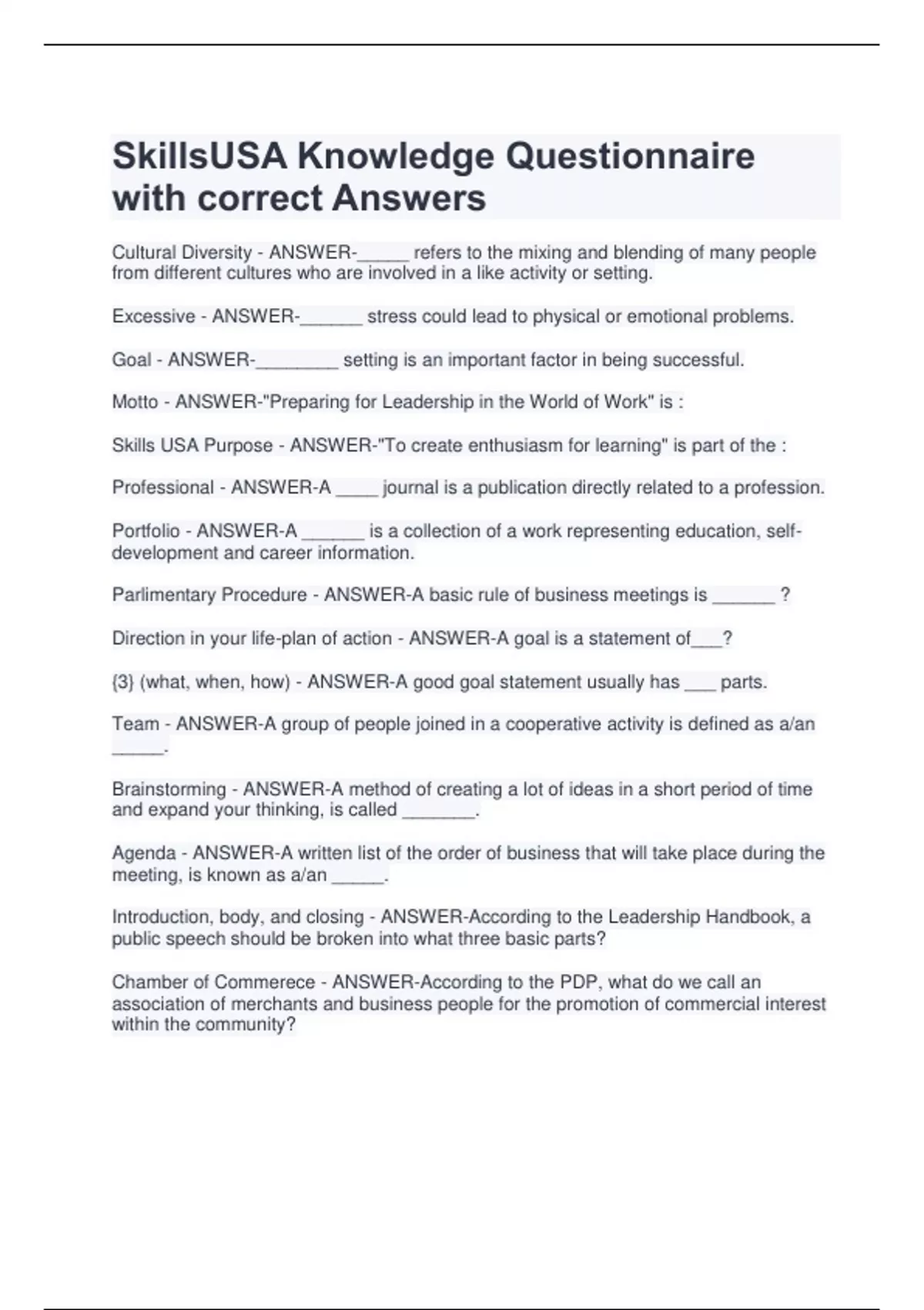 Cultural Diversity - ANSWER-_____ refers to the mixing and blending of many people from different cultures who are involved in a like activity or setting. Excessive - ANSWER-______ stress could lead to physical or emotional problems. Goal - ANSWER-________ setting is an important factor in being successful. Motto - ANSWER-"Preparing for Leadership in the World of Work" is : Skills USA Purpose - ANSWER-"To create enthusiasm for learning" is part of the : Professional - ANSWER-A ____ journal is a publication directly related to a profession. Portfolio - ANSWER-A ______ is a collection of a work representing education, selfdevelopment and career information. Parlimentary Procedure - ANSWER-A basic rule of business meetings is ______ ? Direction in your life-plan of action - ANSWER-A goal is a statement of___? {3} (what, when, how) - ANSWER-A good goal statement usually has ___ parts. Team - ANSWER-A group of people joined in a cooperative activity is defined as a/an _____. Brainstorming - ANSWER-A method of creating a lot of ideas in a short period of time and expand your thinking, is called _______. Agenda - ANSWER-A written list of the order of business that will take place during the meeting, is known as a/an _____. Introduction, body, and closing - ANSWER-According to the Leadership Handbook, a public speech should be broken into what three bas