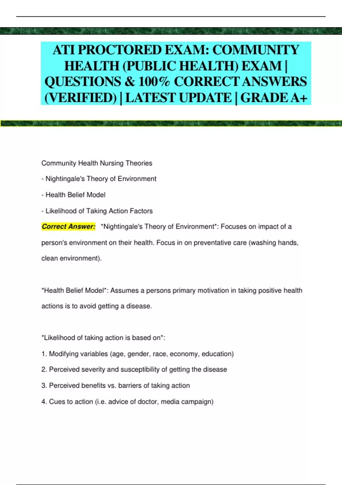 TI PROCTORED EXAM: COMMUNITY HEALTH (PUBLIC HEALTH) EXAM | QUESTIONS & 100% CORRECT ANSWERS (VERIFIED) | LATEST UPDATE | GRADEA+ Community Health Nursing Theories - Nightingale's Theory of Environment - Health Belief Model - Likelihood of Taking Action Factors Correct Answer: *Nightingale's Theory of Environment*: Focuses on impact of a person's environment on their health. Focus in on preventative care (washing hands, clean environment). *Health Belief Model*: Assumes a persons primary motivation in taking positive health actions is to avoid getting a disease. *Likelihood of taking action is based on*: 1. Modifying variables (age, gender, race, economy, education) 2. Perceived severity and susceptibility of getting the disease 3. Perceived benefits vs. barriers of taking action 4. Cues to action (i.e. advice of doctor, media campaign) Community-Based Nursing versus Community-Oriented Nursing Correct Answer: The community or population is the "client" in community health nursing. *Community-Based Nursing*: Focused on ILLNESS care (acute or chronic conditions) for individuals and families. - Examples: Home Health nurse doing wound care, School nurse administering epi-pen. *Community-Oriented Nursing: Focused on improving the collective health of the community. - Examples: Health education and promotion, disease prevention activities. No illness care! Community-oriented nursing = public health nursing. Community Health Nursing versus Public Health Nursing Correct Answer: *Community Health Nursing*: Delivers health care services to individuals, families, and groups. Includes community-based nursing (illness care for individuals and families) AND community-oriented nursing (community focused care, with an emphasis on education and disease prevention). *Public Health Nursing*: Disease prevention and health promotion of communities and populations. They re not providing direct care to individuals! Public health nursing = community-oriented nursing