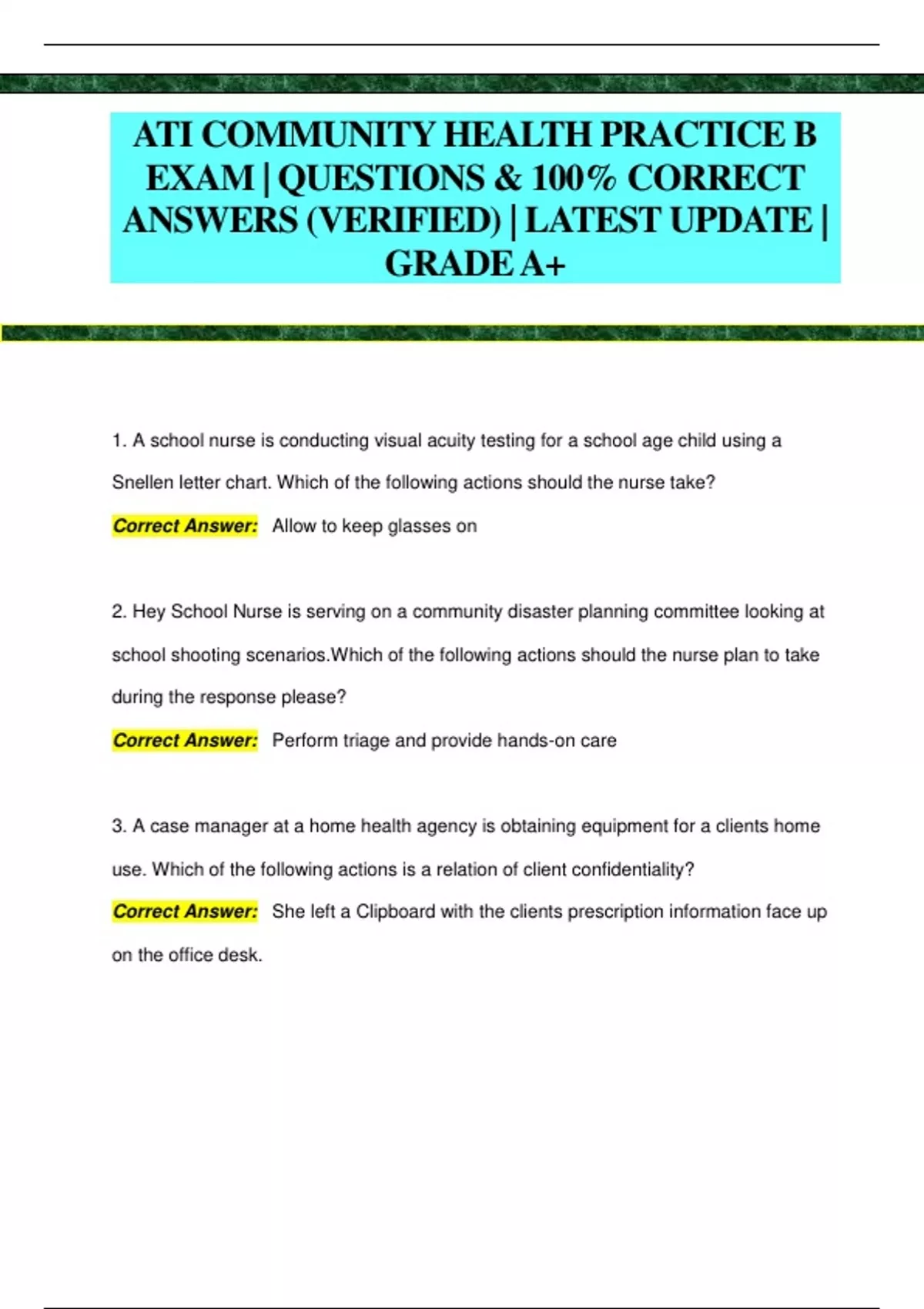 ATI COMMUNITY HEALTH PRACTICE B EXAM | QUESTIONS & 100% CORRECT ANSWERS (VERIFIED) | LATEST UPDATE | GRADEA+ 1. A school nurse is conducting visual acuity testing for a school age child using a Snellen letter chart. Which of the following actions should the nurse take? Correct Answer: Allow to keep glasses on 2. Hey School Nurse is serving on a community disaster planning committee looking at school shooting scenarios.Which of the following actions should the nurse plan to take during the response please? Correct Answer: Perform triage and provide hands-on care 3. A case manager at a home health agency is obtaining equipment for a clients home use. Which of the following actions is a relation of client confidentiality? Correct Answer: She left a Clipboard with the clients prescription information face up on the office desk. 4. A nurse manager at a community health clinic is presenting an in service for nurses about assessing clients who have experienced violence. Which of the following statements by a nurse indicates an understanding of the teaching? Correct Answer: Determine whether a client who has been sexually assaulted requires a rape kit examination. Sexually assaulted victim 5. Hey School Nurse is notified that a school age child has pertussis. Which of the following actions should the school nurse take? Select all that apply Correct Answer: 2 weeks at home after initial symptoms started prophylactic tx immunizations status 6. A nurse is providing education regarding lead exposure to a group of clients who live in a housing development built in 1968. Which of the following client statements indicates an understanding of the teaching