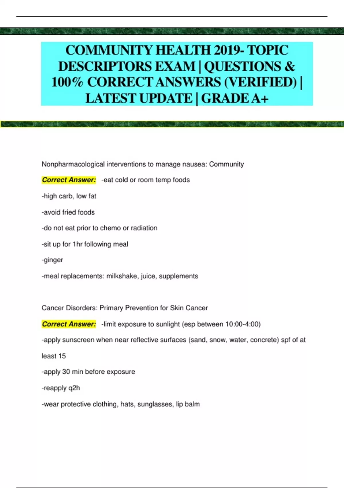 COMMUNITY HEALTH 2019- TOPIC DESCRIPTORS EXAM | QUESTIONS & 100% CORRECT ANSWERS (VERIFIED) | LATEST UPDATE | GRADEA+ Nonpharmacological interventions to manage nausea: Community Correct Answer: -eat cold or room temp foods -high carb, low fat -avoid fried foods -do not eat prior to chemo or radiation -sit up for 1hr following meal -ginger -meal replacements: milkshake, juice, supplements Cancer Disorders: Primary Prevention for Skin Cancer Correct Answer: -limit exposure to sunlight (esp between 10:00-4:00) -apply sunscreen when near reflective surfaces (sand, snow, water, concrete) spf of at least 15 -apply 30 min before exposure -reapply q2h -wear protective clothing, hats, sunglasses, lip balm -avoid indoor tanning Care of Specific Populations: Detecting the Effects of Pesticide Exposure Correct Answer: -Subjective: headache, dizziness, dyspnea, nausea, abdominal cramps, poor concentration, eye irritation -Objective: confusion, irritability, muscle weakness & twitching, nasopharyngeal irritation, vomiting, rash Complications of Pesticide Exposure Correct Answer: -long term: cancer, reproductive problems, parkinson's, liver damage, behavioral issues, impaired fetal development (even from secondary exposure) Client Education: Identifying Client Related Learning Barriers Correct Answer: -age -cultural barriers -poor reading and comprehension skills -language barriers, barriers to access -lack of motivation *materials need to be 6th-8th grade reading level Client Education: Identifying Educator Related Barriers to Learning Correct Answer: anything that prohibits the nurse from interacting with the patient *use of written notes Developing a Health Screening Program Correct Answer: -identify population specific learning needs -consider specific concerns & effects of health needs in a population to determine priority learning need -select aspects of learning theories