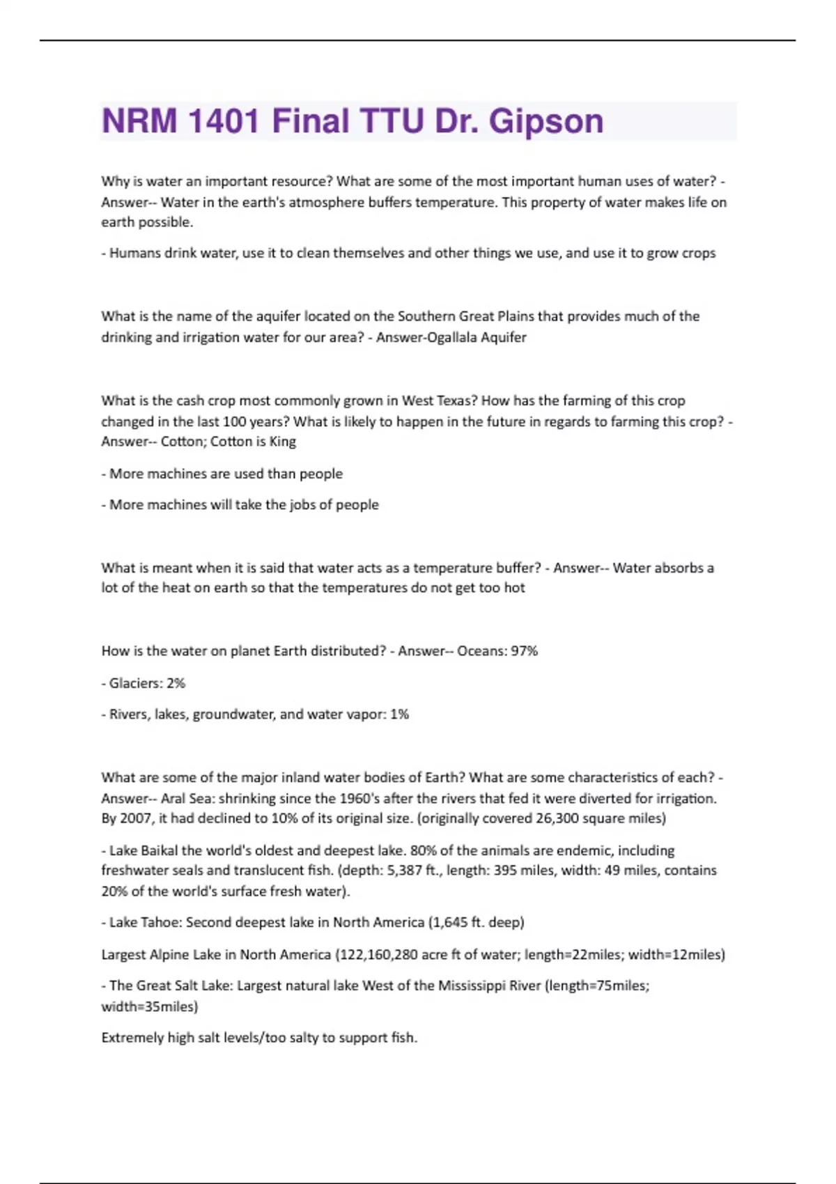 Why is water an important resource? What are some of the most important human uses of water? - Answer-- Water in the earth's atmosphere buffers temperature. This property of water makes life on earth possible. - Humans drink water, use it to clean themselves and other things we use, and use it to grow crops What is the name of the aquifer located on the Southern Great Plains that provides much of the drinking and irrigation water for our area? - Answer-Ogallala Aquifer What is the cash crop most commonly grown in West Texas? How has the farming of this crop changed in the last 100 years? What is likely to happen in the future in regards to farming this crop? - Answer-- Cotton; Cotton is King - More machines are used than people - More machines will take the jobs of people What is meant when it is said that water acts as a temperature buffer? - Answer-- Water absorbs a lot of the heat on earth so that the temperatures do not get too hot How is the water on planet Earth distributed? - Answer-- Oceans: 97% - Glaciers: 2% - Rivers, lakes, groundwater, and water vapor: 1% What are some of the major inland water bodies of Earth? What are some characteristics of each? - Answer-- Aral Sea: shrinking since the 1960's after the rivers that fed it were diverted for irrigation. By 2007, it had declined to 10% of its original size. (originally covered 26,300 square miles) - Lake Baikal the world's oldest and deepest lake. 80% of the animals are endemic, including freshwater seals and translucent fish. (depth: 5,387 ft., length: 395 miles, width: 49 miles, contains 20% of the world's surface fresh water). - Lake Tahoe: Second deepest lake in North America (1,645 ft. deep) Largest Alpine Lake in North America (122,160,280 acre ft of water; length=22miles; width=12miles) - The Great Salt Lake: Largest natural lake West of the Mississippi River (length=75miles; width=35miles) Extremely high salt levels/too salty to support fish.No outflow, thus when tributaries bring salt in, evaporation occurs and the concentration of salt increases. What is the Lake Effect? Where in the U.S. does this occur? - Answer-- The lakes moderate seasonal temperatures by absorbing heat and cooling the air in summer then slowly releasing the heat in autumn. - Occurs in the Great Lakes What is surface tension and what causes it? - Answer-- Cohesion of Water Molecules cause surface tension What is erosion and how does it relate to water? - Answer-- major force for creating landscapes - Soil is carried by water moving on the surface of the earth - sediments are moved from high to low elevation (deltas) What is turbidity? What are some common causes of turbidity? - Answer-- measure sediment that is suspended in water - prevents light penetration - limiting plant growth and thus, photosynthesis How can water, or the lack thereof, serve as a barrier to animal and plant populations? - Answer-- Water often serves as an isolating mechanism for populations of animals Swimming ability of terrestrial species (distance) Seed dispersal Temperature, salinity, dissolved O2, turbidity What are guzzlers? - Answer-Manmade watering holes