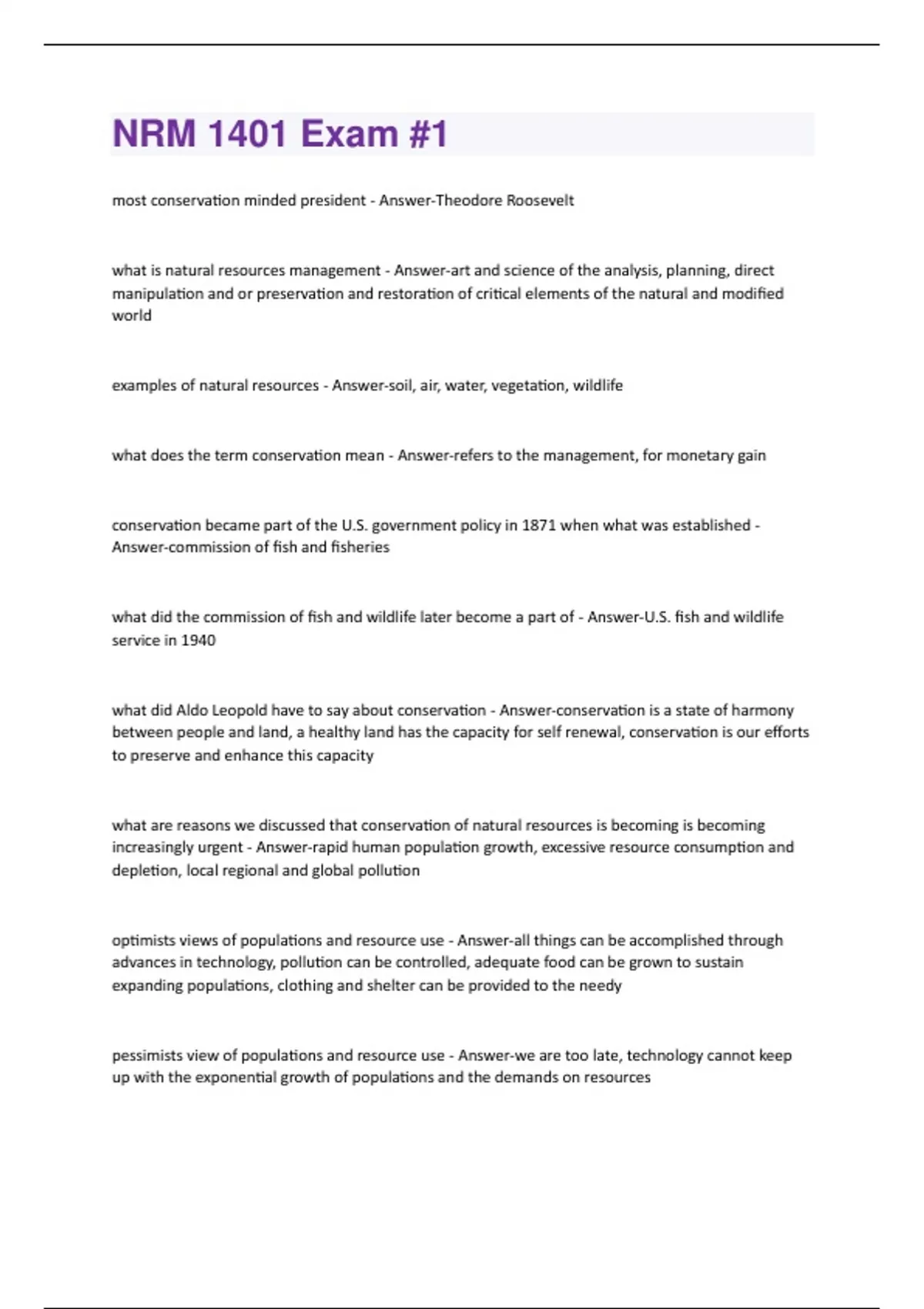 most conservation minded president - Answer-Theodore Roosevelt what is natural resources management - Answer-art and science of the analysis, planning, direct manipulation and or preservation and restoration of critical elements of the natural and modified world examples of natural resources - Answer-soil, air, water, vegetation, wildlife what does the term conservation mean - Answer-refers to the management, for monetary gain conservation became part of the U.S. government policy in 1871 when what was established - Answer-commission of fish and fisheries what did the commission of fish and wildlife later become a part of - Answer-U.S. fish and wildlife service in 1940 what did Aldo Leopold have to say about conservation - Answer-conservation is a state of harmony between people and land, a healthy land has the capacity for self renewal, conservation is our efforts to preserve and enhance this capacity what are reasons we discussed that conservation of natural resources is becoming is becoming increasingly urgent - Answer-rapid human population growth, excessive resource consumption and depletion, local regional and global pollution optimists views of populations and resource use - Answer-all things can be accomplished through advances in technology, pollution can be controlled, adequate food can be grown to sustain expanding populations, clothing and shelter can be provided to the needy pessimists view of populations and resource use - Answer-we are too late, technology cannot keep up with the exponential growth of populations and the demands on resourcesecological principles of sustainability put forth by Daniel Chiras and how will they help enhance sustainability - Answer-conservation, recycling, renewable resource use, restoration, population control/ management, adaptability. (help steer humanity on a sustainable course) key components of what conservation means today - Answer-conserving the earth by protecting and enhancing its capacity, emphasizes protection of entire ecological regions, reconciling human use specific pieces of legislation that support conservation - Answer-national environmental policy act (NEPA), clean water act, clean air act, endangered species act, marine mammal protection act, migratory bird treaty act important events in the 1960s - Answer-realization that the quality of the air and water of the nation had reached hazardous levels, many species were in serious decline because of environmental factors as well as human actions why were the 1970s the golden age - Answer-many acts were passed