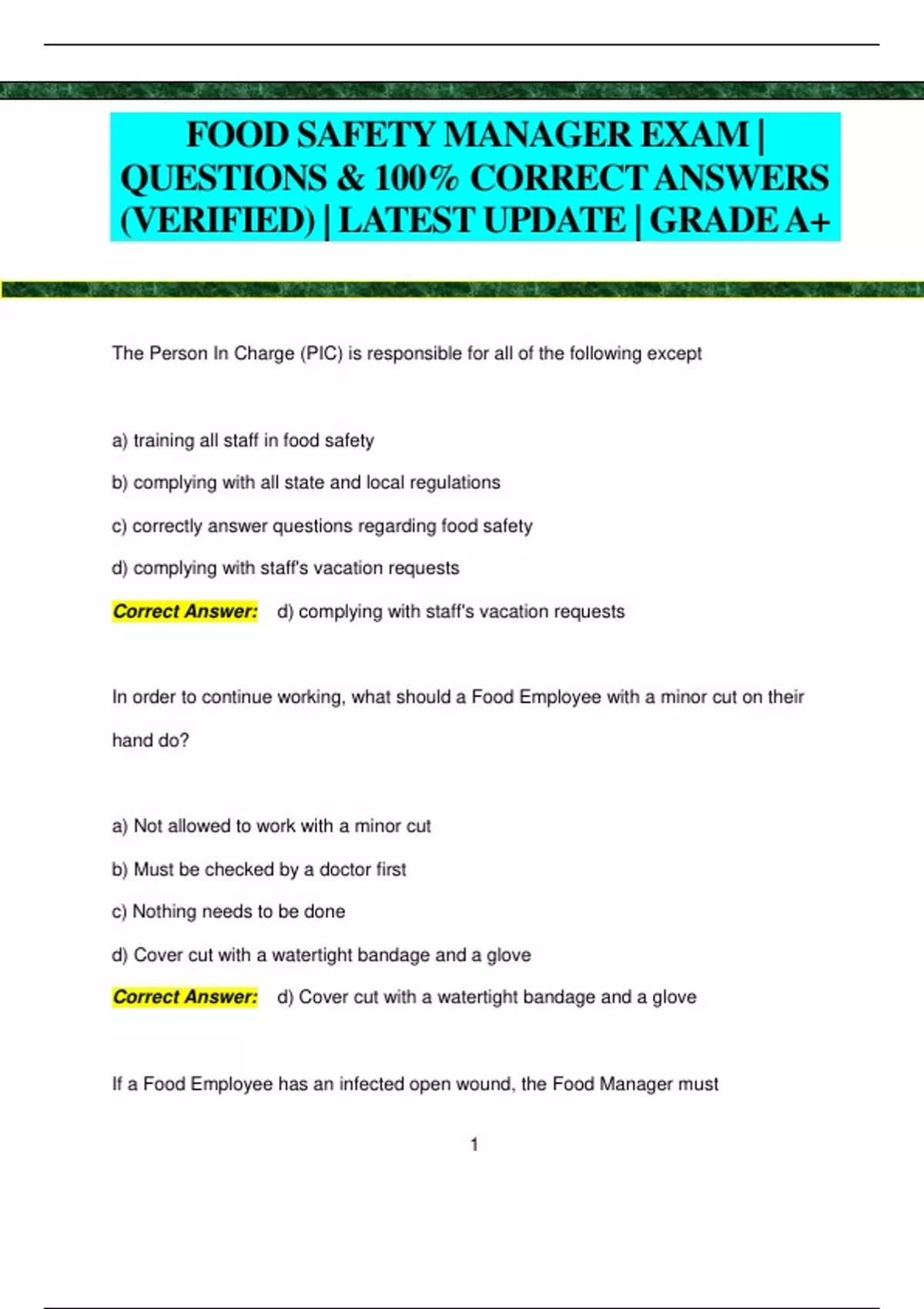 FOOD SAFETY MANAGER EXAM | QUESTIONS & 100% CORRECT ANSWERS (VERIFIED) | LATEST UPDATE | GRADEA+ The Person In Charge (PIC) is responsible for all of the following except a) training all staff in food safety b) complying with all state and local regulations c) correctly answer questions regarding food safety d) complying with staff's vacation requests Correct Answer: d) complying with staff's vacation requests In order to continue working, what should a Food Employee with a minor cut on their hand do? a) Not allowed to work with a minor cut b) Must be checked by a doctor first c) Nothing needs to be done d) Cover cut with a watertight bandage and a glove Correct Answer: d) Cover cut with a watertight bandage and a glove If a Food Employee has an infected open wound, the Food Manager must 2 a) Restrict the employee from working with the open food b) Send the employee to a doctor c) Allow the employee to work only with salads d) Exclude the employee for working until a letter from a doctor is received Correct Answer: a) Restrict the employee from working with the open food All of the following are used to handle ready-to-eat foods except a) bare hands b) tongs c) gloved hands d) deli paper Correct Answer: a) bare hands It is most important for an employee to use proper handwashing techniques after they a) talk on the phone b) use a restroom c) take an order d) drink from a closed container Correct Answer: b) use a restroom 3 An inspection can occur only a) when the Person in Charge is present b) when the inspector notifies the facility 24 hours in advance c) when the facility is open or during reasonable hours d) when the facility is not too busy Correct Answer: c) when the facility is open or during reasonable hours An employee must wash their hands in all of the following situations except a) before putting gloves on b) after handling raw pork c) after sneezing d) before mopping the floor Correct Answer: d) before mopping the floor Where should a Food Employee take a break to smoke? a) In the dry storage area b) In the kitchen c) In designated areas only d) In the walk-in cooler Correct Answer: c) In designated areas onl