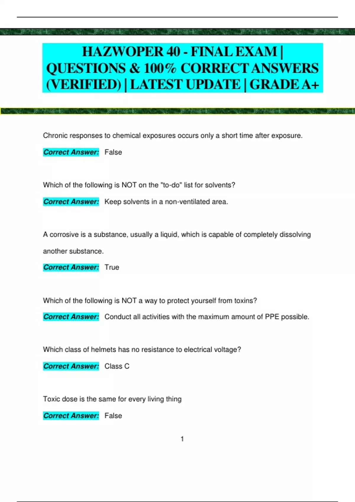 HAZWOPER 40 - FINAL EXAM | QUESTIONS & 100% CORRECT ANSWERS (VERIFIED) | LATEST UPDATE | GRADEA+ Chronic responses to chemical exposures occurs only a short time after exposure. Correct Answer: False Which of the following is NOT on the "to-do" list for solvents? Correct Answer: Keep solvents in a non-ventilated area. A corrosive is a substance, usually a liquid, which is capable of completely dissolving another substance. Correct Answer: True Which of the following is NOT a way to protect yourself from toxins? Correct Answer: Conduct all activities with the maximum amount of PPE possible. Which class of helmets has no resistance to electrical voltage? Correct Answer: Class C Toxic dose is the same for every living thing Correct Answer: False 2 Which of the following is NOT a step that should be covered in an emergency response procedure? Correct Answer: Clarification An OSHA standard dealing with general slip and fall protection would be an example of ______. Correct Answer: Horizontal A change in season, weather, or changes in job tasks are examples of reassessment indicators for a site. Correct Answer: True The contingency plan should include ______ personnel. Correct Answer: Both on and off-site A decontamination plan should be developed ______ any operations begin with any hazardous substances. Correct Answer: Before When the exposure of two different toxic chemicals produces a more severe effect than either one alone is called ______ interaction. Correct Answer: Synergisitic 3 Where are titles representing broad areas that are subject to Federal regulation found? Correct Answer: Code of Federal Regulations Which one of the following is a step in treatment for solvent exposure? Correct Answer: Both A and C In the Code of Federal Regulations, which section explains who is subject to the regulation and under what circumstances? Correct Answer: Scope and application paragraph The entry team and reserves should always consist of how many persons? Correct Answer: [X] 3