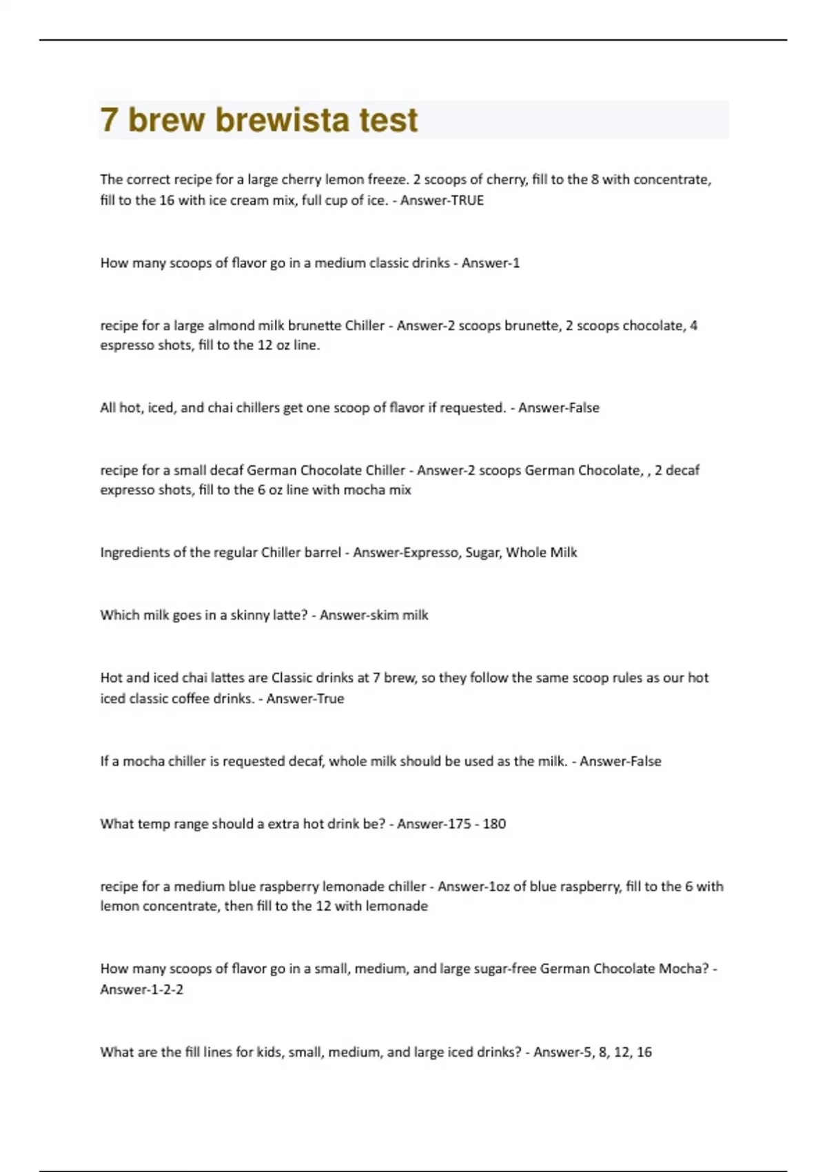 The correct recipe for a large cherry lemon freeze. 2 scoops of cherry, fill to the 8 with concentrate, fill to the 16 with ice cream mix, full cup of ice. - Answer-TRUE How many scoops of flavor go in a medium classic drinks - Answer-1 recipe for a large almond milk brunette Chiller - Answer-2 scoops brunette, 2 scoops chocolate, 4 espresso shots, fill to the 12 oz line. All hot, iced, and chai chillers get one scoop of flavor if requested. - Answer-False recipe for a small decaf German Chocolate Chiller - Answer-2 scoops German Chocolate, , 2 decaf expresso shots, fill to the 6 oz line with mocha mix Ingredients of the regular Chiller barrel - Answer-Expresso, Sugar, Whole Milk Which milk goes in a skinny latte? - Answer-skim milk Hot and iced chai lattes are Classic drinks at 7 brew, so they follow the same scoop rules as our hot iced classic coffee drinks. - Answer-True If a mocha chiller is requested decaf, whole milk should be used as the milk. - Answer-False What temp range should a extra hot drink be? - Answer-175 - 180 recipe for a medium blue raspberry lemonade chiller - Answer-1oz of blue raspberry, fill to the 6 with lemon concentrate, then fill to the 12 with lemonade How many scoops of flavor go in a small, medium, and large sugar-free German Chocolate Mocha? - Answer-1-2-2 What are the fill lines for kids, small, medium, and large iced drinks? - Answer-5, 8, 12, 16How many scoops of flavor go in a medium iced strawberry lemonade? - Answer-1 What is the temperature ranger for a hot drink ordered "drinkable"? - Answer-140 - 150 Ingredients of the mocha Chiller Barrel - Answer-Expresso, Mocha Mix How many scoops of flavor go in a large Classic drinks? - Answer-1 How Many scoops of flavor go in a large iced strawberry lemonade? - Answer-2 How many total ounces of flavor, expresso shots, and milk would be in a small almond milk mocha Chiller? - Answer-6 recipie for a large decaf mocha chiller? - Answer-4 scoops chocolate, 4 decaf expresso shots, fill to the 12 with mocha mix Other than a kids drink, if you burn your milk or get too hot, you can add cold milk to bring it down to the correct temperature. - Answer-False Seven Fizz's are made with flavor first, then Seven Fizz, pour over ice, tom-tom, and then add cream if requested. - Answer-False recipe for a small chocolate-charamel shake? - Answer-1 oz chocolate, 1 oz caramel, fill to the 8 oz with ice cream mix ALL Classic drinks use two expresso shots for a small, two for a medium, and four for a large. - Answer-False What milk goes in a cappuccino? - Answer-whole milk A caramel mocha, a hot house blend, and an irish cream latte are all classic drinks. - Answer-TrueWhich question should you ask a customer who orders a Seven Fizz? - Answer-Would you like cream in your soda? How many scoops of flavor go in a large Seven Fizz? - Answer-4 How many ounces of liquid would you add to a light ice drink? - Answer-4 ounces Select the classic drinks that use two espresso shots for a small, two for a medium, and four for a large. - Answer-Latte, Breve, Cappuccino How many scoops of flavor go in a small, medium, and large Original Mocha? - Answer-1 - 1 - 2 How many scoops of flavor go in a small Seven Fizz? - Answer-2 How many scoops of flavor go in a medium raspberry green tea chiller? - Answer-1 White is the second ingredient of any coffee drink that has flavor? - Answer-Shots recipe for a medium vanilla shake? - Answer-3 oz vanilla, 9 oz ice cream mix How many scoops of flavor go in a large iced sweet black tea? - Answer-3 Select all Classic coffee drinks. - Answer-Breve, Americano, Cappuccino, Latte How many scoops flavor go in a medium Original Mocha?` - Answer-1 A large light ice drink will have 22 ounces of total liquid. - Answer-False Select all temperatures that are too hot for kids drinks - Answer-121, 130, 140 recipe for a blue raspberry Kids Fizz? - Answer-1 scoop blue raspberry, fill to the 5 oz line with sparkling waterHow many scoops of flavor go in a medium peach-raspberry 7 Energy Chiller? - Answer-1/2 scoop raspberry, 1/2 scoop peach What is the correct recipe for a medium iced blue raspberry 7 Energy? - Answer-1 scoop blue raspberry, fill to the 12 oz line with 7 energy What is the correct way to build a large iced pineapple 7 Energy? - Answer-2 scoops pineapple, fill to the 16 oz line with 7 Energy, then pour over ice What is the correct recipe for a large sugar-free coconut 7 Energy Chiller? - Answer-4 scoops sugarfree coconut, fill to the 16 oz line with sugar-free 7 Energy and add ice
