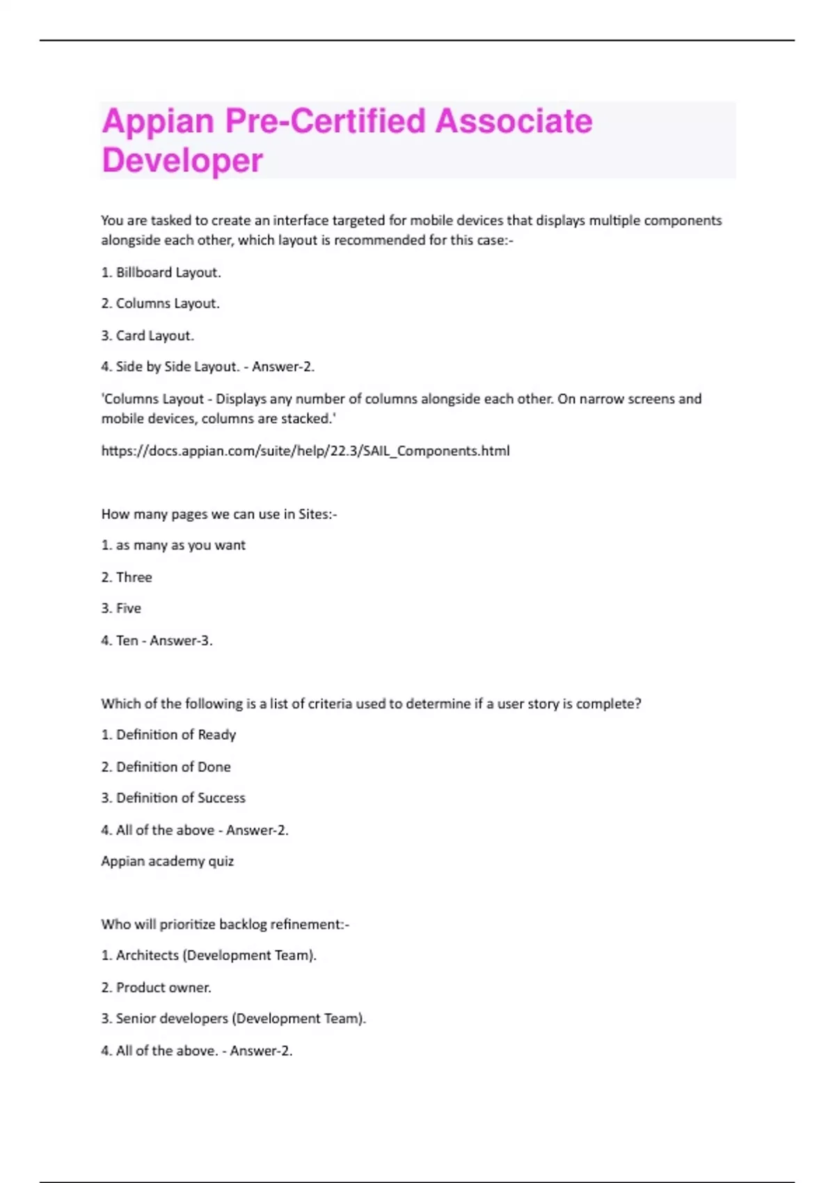 You are tasked to create an interface targeted for mobile devices that displays multiple components alongside each other, which layout is recommended for this case:- 1. Billboard Layout. 2. Columns Layout. 3. Card Layout. 4. Side by Side Layout. - Answer-2. 'Columns Layout - Displays any number of columns alongside each other. On narrow screens and mobile devices, columns are stacked.' How many pages we can use in Sites:- 1. as many as you want 2. Three 3. Five 4. Ten - Answer-3. Which of the following is a list of criteria used to determine if a user story is complete? 1. Definition of Ready 2. Definition of Done 3. Definition of Success 4. All of the above - Answer-2. Appian academy quiz Who will prioritize backlog refinement:- 1. Architects (Development Team). 2. Product owner. 3. Senior developers (Development Team). 4. All of the above. - Answer-2."The meetings are attended by the full development team, the product owner and any additional subject matter experts invited by the product owner" "At this time the User Stories should already be prepared by the Product Owner to what he believes is Definition of Ready" How to send alerts to user groups:- 1. Its a deprecated function, you cant send alerts to groups, only to individual users only. 2. By using custom error alert setting. 3. By sending the error content using send Email node. 4. By enabling deadlines. - Answer-2. ...dead link How to start a process model from an Interface, select 3 answers:- 1- a!processTaskLink(). 2- a!startProcess(). 3- a!startProcessLink(). 4- Start Process Smart Service 5- Record Action. - Answer-(2/3/5) Which of these is a possible way to index the 2nd element of the which contains {2,1} :- 1. .2 2. index(,"2",null) 3. fn!wherecontains(2,) 4. [2*1] - Answer-4. you can use expressions between the [ ] brackets