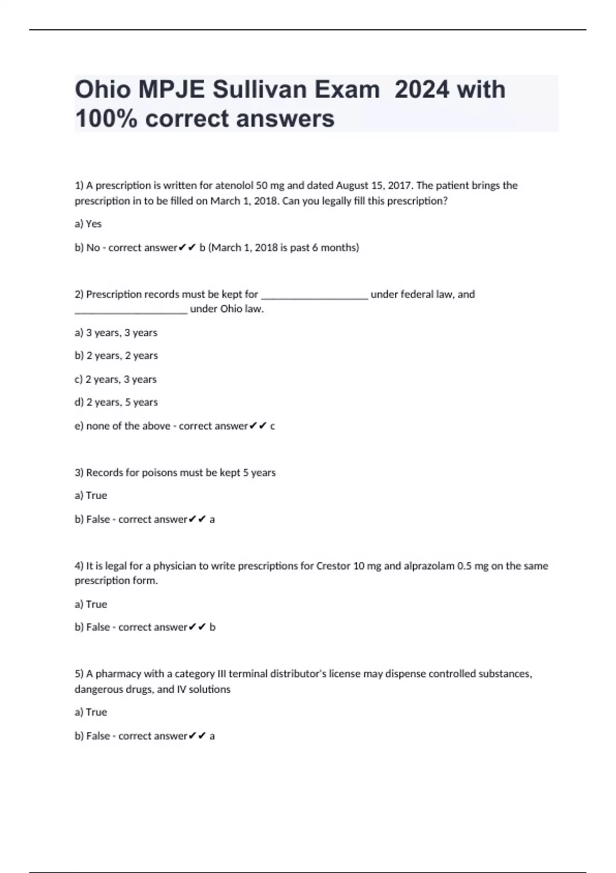 1) A prescription is written for atenolol 50 mg and dated August 15, 2017. The patient brings the prescription in to be filled on March 1, 2018. Can you legally fill this prescription? a) Yes b) No - correct answer b (March 1, 2018 is past 6 months) 2) Prescription records must be kept for ___________________ under federal law, and ____________________ under Ohio law. a) 3 years, 3 years b) 2 years, 2 years c) 2 years, 3 years d) 2 years, 5 years e) none of the above - correct answer c 3) Records for poisons must be kept 5 years a) True b) False - correct answer a 4) It is legal for a physician to write prescriptions for Crestor 10 mg and alprazolam 0.5 mg on the same prescription form. a) True b) Fal