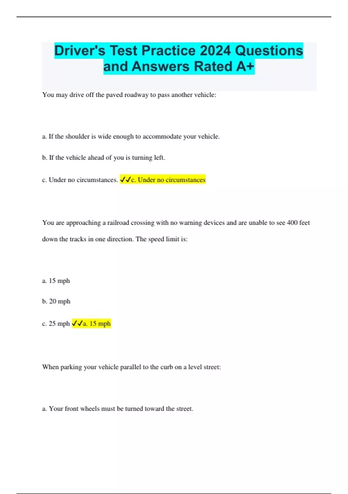 Driver's Test Practice 2024 Questions and Answers Rated A+ You may drive off the paved roadway to pass another vehicle: a. If the shoulder is wide enough to accommodate your vehicle. b. If the vehicle ahead of you is turning left. c. Under no circumstances. c. Under no circumstances You are approaching a railroad crossing with no warning devices and are unable to see 400 feet down the tracks in one direction. The speed limit is: a. 15 mph b. 20 mph c. 25 mph a. 15 mph When parking your vehicle parallel to the curb on a level street: a. Your front wheels must be turned toward the street. b. Your wheels must be within 18 inches of the curb. c. One of your rear wheels must touch the curb. b. Your wheels must be within 18 inches of the curb When you are merging onto the freeway, you should be driving: a. At or near the same speed as the traffic on the freeway. b. 5 or 10 MPH slower than the traffic on the freeway. c. The posted speed limit for traffic on the freeway. a. At or near the same speed as the traffic on the freeway When driving in fog, you should use your: a. Fog lights only b. High beams c. Low beams c. Low beams A white-painted curb means: a. Loading zone for freight or passengers. b. Loading zone for passengers or mail only. c. Loading zone for freight only. b. Loading zone for passengers or mail only. A school bus ahead of you in your lane is stopped with red lights flashing. You should: a. Stop, then proceed when you think all of the children have exited the bus. b. Slow to 25 MPH and pass cautiously. c. Stop as long as the red lights are flashing. c. Stop as long as the red lights are flashing. California's "Basic Speed Law" says: a. You should never drive faster than posted