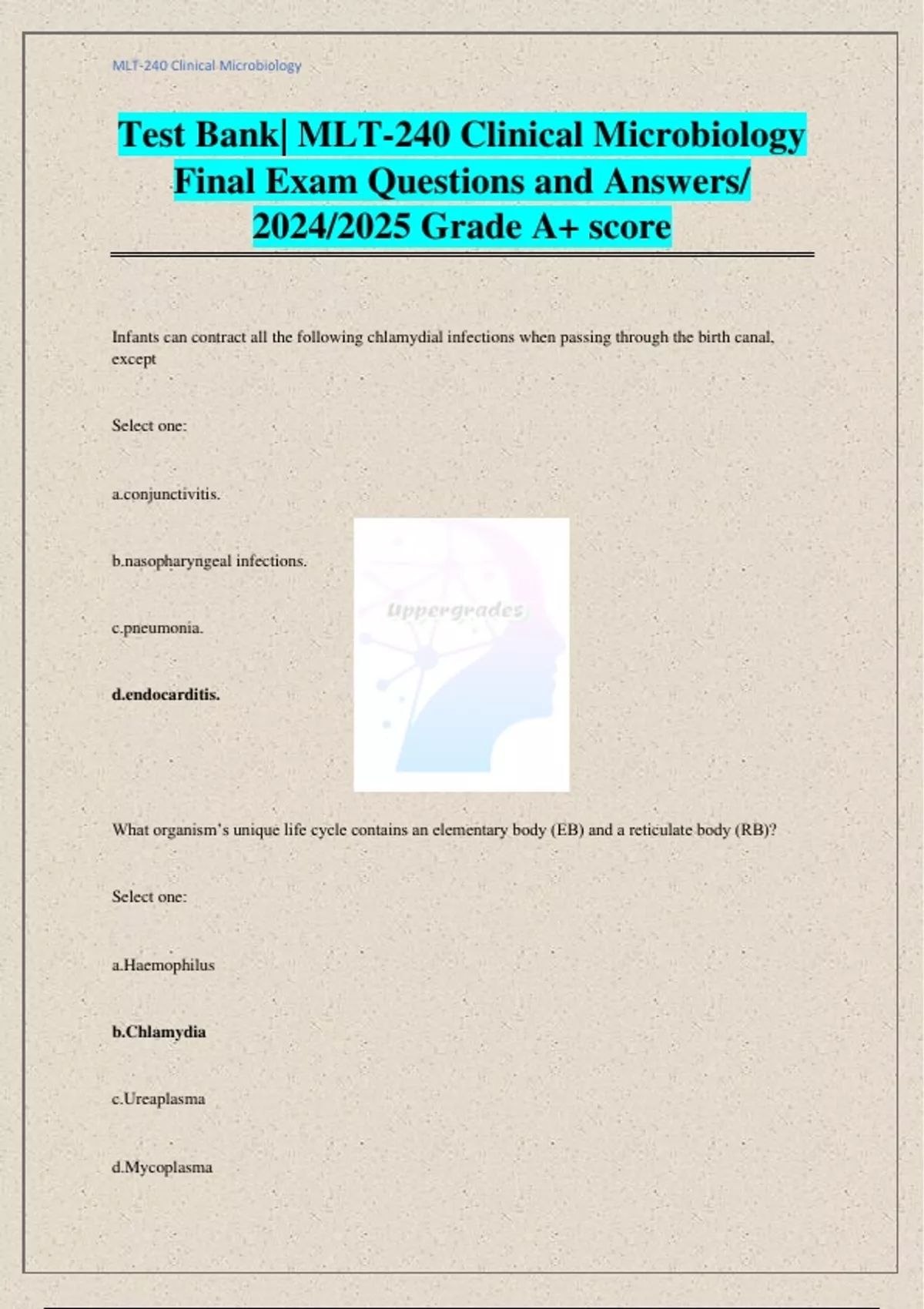 Test Bank| MLT-240 Clinical Microbiology Final Exam Questions and Answers/ 2024/2025 Grade A+ score,Test Bank| MLT-240 Clinical Microbiology Final Exam Questions and Answers/ 2024/2025 Grade A+ score