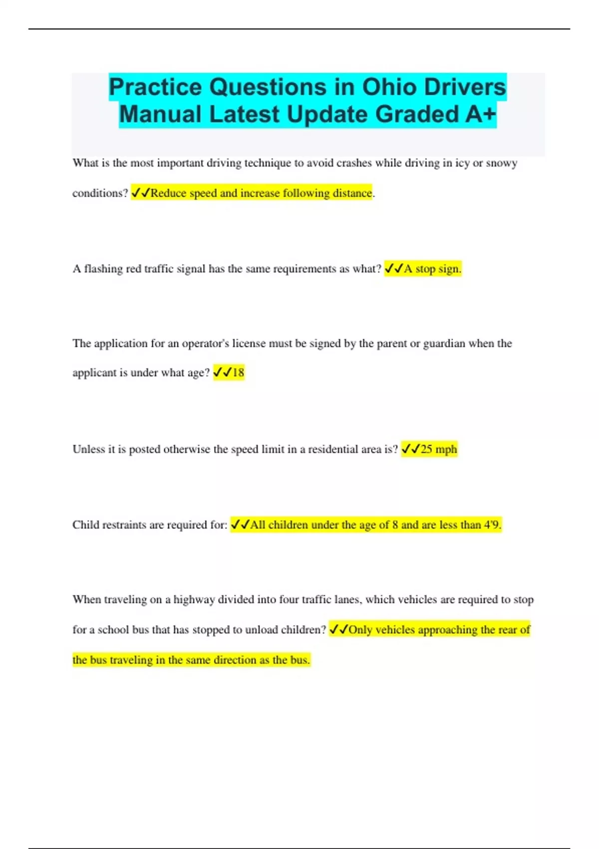 Practice Questions in Ohio Drivers Manual Latest Update Graded A+ What is the most important driving technique to avoid crashes while driving in icy or snowy conditions? Reduce speed and increase following distance. A flashing red traffic signal has the same requirements as what? A stop sign. The application for an operator's license must be signed by the parent or guardian when the applicant is under what age? 18 Unless it is posted otherwise the speed limit in a residential area is? 25 mph Child restraints are required for: All children under the age of 8 and are less than 4'9. When traveling on a highway divided into four traffic lanes, which vehicles are required to stop for a school bus that has stopped to unload children? Only vehicles approaching the rear of the bus traveling in the same direction as the bus. When two vehicles arrive at an intersection at the same time, which one has the right-of-way when no signs or signals indicate rules? The car approaching from the right has the right-of- way. If someone has consumed alcoholic drinks, what will help the person overcome the influence of those drinks? Time. When is a driver permitted to turn right on a red traffic signal? When the driver has stopped and checked to see that the turn will not interfere with crossing traffic. When a stop is required at an intersection and no markings appear to indicate a stop line or crosswalk,where is the appropriate place to make the stop? At the point nearest the intersecting roadway where the driver has view of approaching traffic on the intersecting roadway before actually entering the roadway.