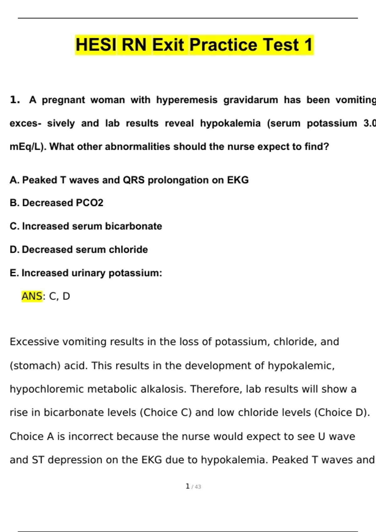 HESI RN Exit Practice Test 1 Questions and Answers (2024 / 2025) (Verified Answers).1. A pregnant woman with hyperemesis gravidarum has been vomiting exces- sively and lab results reveal hypokalemia (serum potassium 3.0 mEq/L). What other abnormalities should the nurse expect to find? A. Peaked T waves and QRS prolongation on EKG B. Decreased PCO2 C. Increased serum bicarbonate D. Decreased serum chloride E. Increased urinary potassium: ANS: C, D Excessive vomiting results in the loss of potassium, chloride, and (stomach) acid. This results in the development of hypokalemic, hypochloremic metabolic alkalosis. Therefore, lab results will show a rise in bicarbonate levels (Choice C) and low chloride levels (Choice D). Choice A is incorrect because the nurse would expect to see U wave and ST depression on the EKG due to hypokalemia. Peaked T waves and QRS prolongation are signs of hyperkalemia. Choice B is incorrect because the PCO2 will be increased (i.e. the client will be hypoventilating) to compensate for the rise in bicarbonate. Choice E is incorrect because this client is hypokalemic as a result of excess vomiting and not as a result of renal potassium loss. the kidneys will minimize potassium excretion in an attempt to raise serum potassium levels. 2. A clear liquid diet is ordered for a client scheduled for a colonoscopy. Which food selection indicates that teaching has been effective? (Select all that apply) A. Gelatin B. Orange juice with pulp C. Cappuccino D. Tea with honey E. Broth: ANS: A, D, E Clients on clear liquid diet can- as the name implies- only consume clear liquids. No solids are included in this diet. Option A (gelatin), D (tea with honey), and E (broth) are proper choices for a client on a clear liquid diet. Choice B is incorrect because pulp cannot be consumed while on a liquid diet. The client is permitted to drink clear juices such as apple juice or grape juice without pulp. Choice C is incorrect because a cappuccino contains milk, which is not permitted on a clear liquid diet. The client is permitted to drink a cup of dark coffee without milk