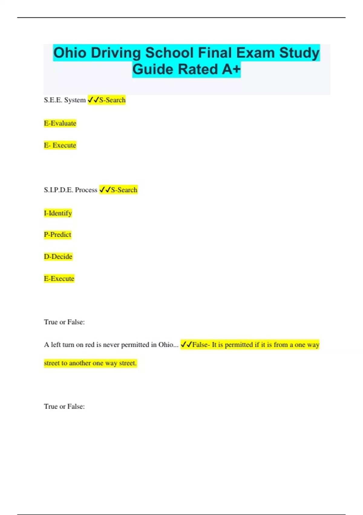 Ohio Driving School Final Exam Study Guide Rated A+ S.E.E. System S-Search E-Evaluate E- Execute S.I.P.D.E. Process S-Search I-Identify P-Predict D-Decide E-Execute True or False: A left turn on red is never permitted in Ohio... False- It is permitted if it is from a one way street to another one way street. True or False: Under OVI laws you can't be arrested for driving impaired if your BAC is less than .08. False- You can be arrested regardless, as long as you drank alcohol and your driving can put you or others in danger than you can be arrested. How can you recover from any type of skid? Keep your eyes where you want to go, and then let off the gas. The Ohio Graduating Driver Licensing Law requires that your parents MUST drive with you for a minimum of 50 hours... how many hours need to be at night. 10 hours have to be at night. How often should a PRE-DRIVE CHECK be performed? Every time you drive. True or False: It's not possible to die from drinking a large amount of alcohol quickly. False What is breaking distance? When you hit the brake, til the car stops. What are two things that you can change when reacting to a hazard? 1.)Speed 2.)Direction What is the number 1 factor in most collisions? Driver Error True or False: In Ohio the minimum legal tread depth is 1/32 of an inch. False - The legal tread depth is 1/16 of an inch What is the minimum distance you can park from a curb. The minimum distance is 12 inches. True or False: A 6 point violation in Ohio is the most serious of driving infractions. True When backing a car to the right, turn the steering wheel to the _________________. Right Alcohol is a drug. What type of drug is it? It is a depressant.