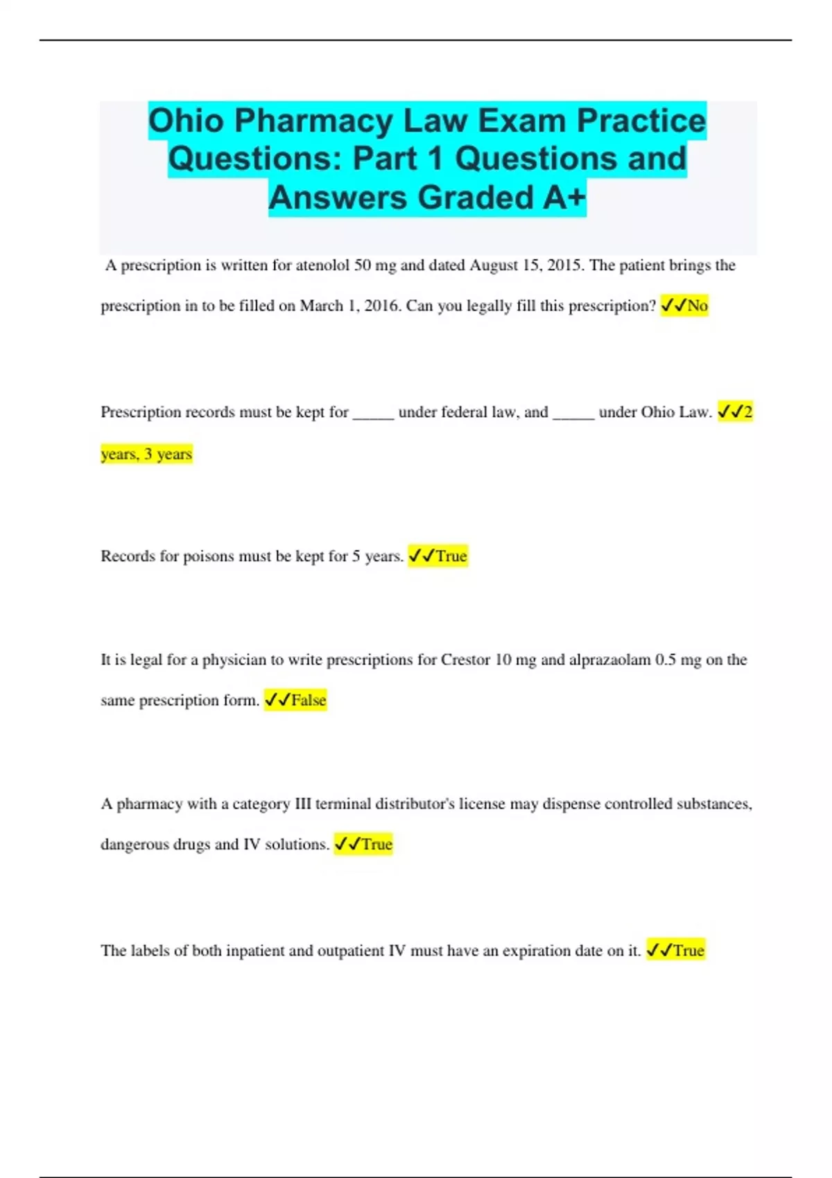 Ohio Pharmacy Law Exam Practice Questions: Part 1 Questions and Answers Graded A+ A prescription is written for atenolol 50 mg and dated August 15, 2015. The patient brings the prescription in to be filled on March 1, 2016. Can you legally fill this prescription? No Prescription records must be kept for _____ under federal law, and _____ under Ohio Law. 2 years, 3 years Records for poisons must be kept for 5 years. True It is legal for a physician to write prescriptions for Crestor 10 mg and alprazaolam 0.5 mg on the same prescription form. False A pharmacy with a category III terminal distributor's license may dispense controlled substances, dangerous drugs and IV solutions. True The labels of both inpatient and outpatient IV must have an expiration date on it. True A prescription container (like a bottle Timpotic XE) too small to bear a complete label must have at least the following information on it: Rx Number & Patient name A pharmacist comes to work one day early in the morning and notices that all of the Adderall XR has been stolen. The pharmacist must notify: Board of Pharmacy & DEA Which of the following is false regarding multiple drugs in the same container? A. Only a maximum of 31 days supply of medication can be dispensed. B. The expiration date of the container cannot be for more than 60 days. C. When one drug is discontinued, everything in the package is adulterated. D. There must be regular outpatient labels for each drug in the container. E. All of the above are true. E. all of the above are true A doctor licensed in Florida writes a prescription in Florida for a patient on vacation. The patient brings the prescription back to Ohio. Can you fill it? Yes The definition of a poison is a chemical deleterious to an adult's life in quantities of 6 grams or less. False. (in quantities of 4 grams or less) When a patient requests their medical records from a pharmacy, HIPAA states that they have access to all patient notes and comments that pharmacist has entered into the computer as well. True Under Ohio law, Nexium 40 mg is considered a drug of abuse. True (Any prescription drug is considered a drug of abuse) Pharmacists have ____ hours to verify and sign the daily printout of prescriptions for that day. Within a reasonable amount of time Insurance companies have access to only those patient prescription records for medications they paid for. True Controlled substances can be mailed