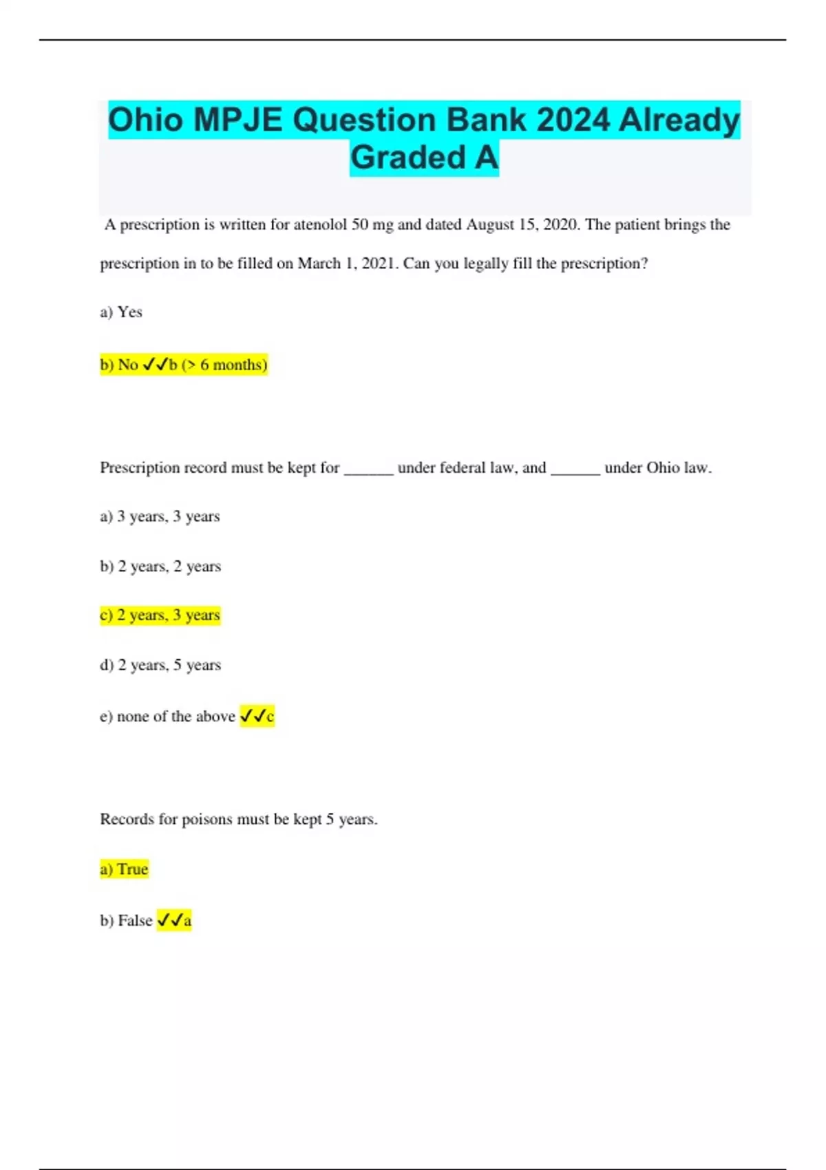 Ohio MPJE Question Bank 2024 Already Graded A A prescription is written for atenolol 50 mg and dated August 15, 2020. The patient brings the prescription in to be filled on March 1, 2021. Can you legally fill the prescription? a) Yes b) No b (> 6 months) Prescription record must be kept for ______ under federal law, and ______ under Ohio law. a) 3 years, 3 years b) 2 years, 2 years c) 2 years, 3 years d) 2 years, 5 years e) none of the above c Records for poisons must be kept 5 years. a) True b) False a It is legal for a physician to write prescriptions for rosuvastatin 10 mg and alprazolam 0.5 mg on the prescription form. a) True b) False b A pharmacy with a category III terminal distributor's license may dispense controlled substances, dangerous drugs, and IV solutions. a) True b) False a The labels of both inpatient and outpatient IV (intravenous medications) must have an expiration date on it. a) True b) False a A prescription container (like a bottle Timoptic XE) too small to bear a complete label must have at least the following information on it. Select all that apply. a) Rx number b) patient name c) directions for use d) prescriber name e) refills a and b A pharmacist comes to work one day early in the morning and notices that all of the Adderall XR has been stolen. The pharmacist must notify... a) Board of Pharmacy b) Local Law Enforcement c) DEA d) a and c only e) a, b, and c e Which of the following are false regarding multiple drugs in the same container? Select all that apply. a) Only a maximum of 31 days supply of medication can be dispensed b) The expiration date of the container cannot be for more than 31 days. c) When one drug is discontinued, everything in the package is adulterated d) There must be regular outpatient labels for each drug in the container