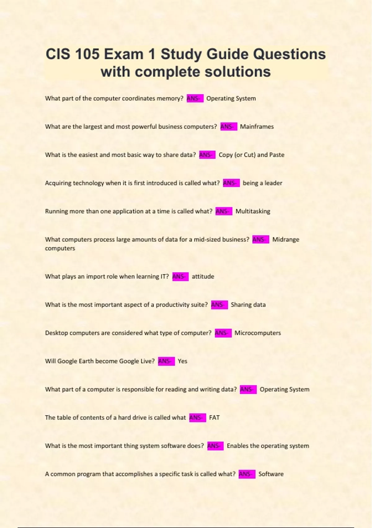 CIS 105 Exam 1 Study Guide Questions with complete solutions CIS 105 Exam 1 Study Guide Questions with complete solutions
