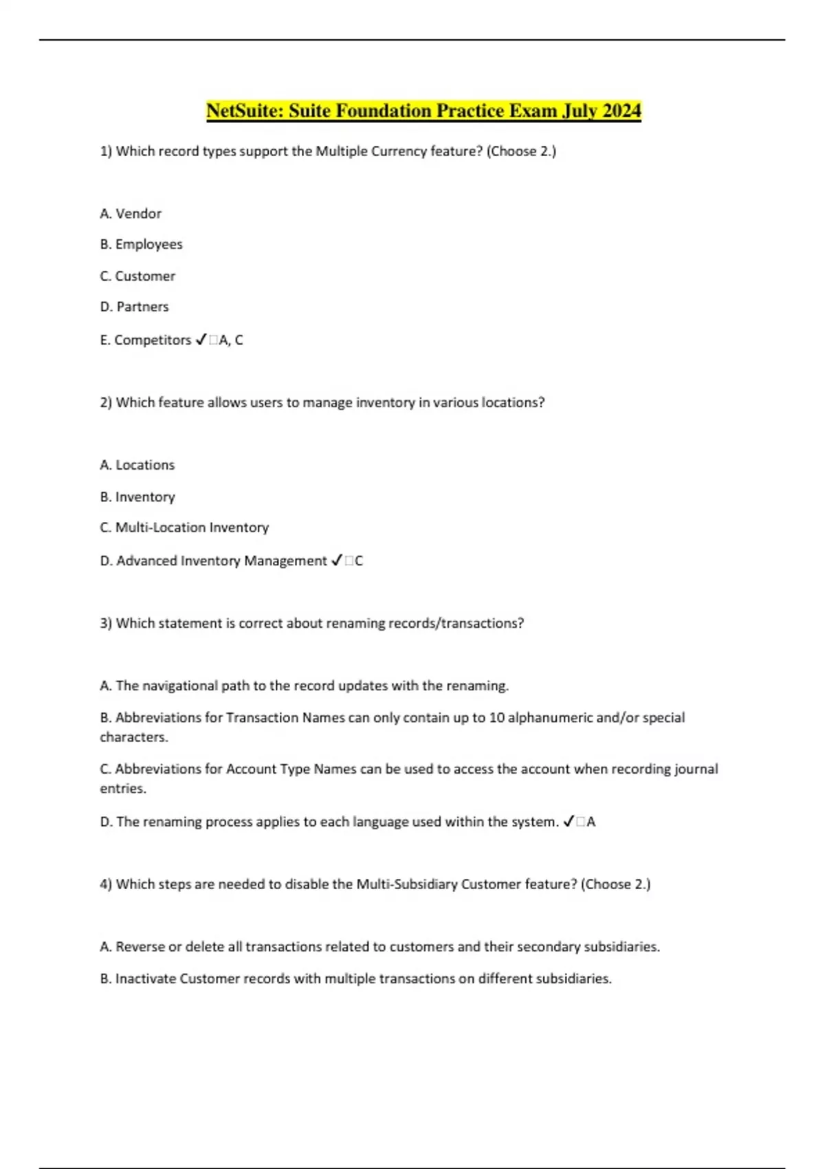 NetSuite: Suite Foundation Practice Exam July 2024 1) Which record types support the Multiple Currency feature? (Choose 2.) A. Vendor B. Employees C. Customer D. Partners E. Competitors ️A, C 2) Which feature allows users to manage inventory in various locations? A. Locations B. Inventory C. Multi-Location Inventory D. Advanced Inventory Management ️C 3) Which statement is correct about renaming records/transactions? A. The navigational path to the record updates with the renaming. B. Abbreviations for Transaction Names can only contain up to 10 alphanumeric and/or special characters. C. Abbreviations for Account Type Names can be used to access the account when recording journal entries. D. The renaming process applies to each language used within the system. ️A 4) Which steps are needed to disable the Multi-Subsidiary Customer feature? (Choose 2.) A. Reverse or delete all transactions related to customers and their secondary subsidiaries. B. Inactivate Customer records with multiple transactions on different subsidiaries. C. Remove all secondary subsidiaries from Customer records. D. Set only one primary subsidiary and one secondary subsidiary in the Customer record. ️A, C 5) Which is considered the primary classification used to organize records in a NetSuite OneWorld account? A. Departments B. Classes C. Subsidiaries D. Locations ️C 6) Which field type can be used to track Employee birthdays? A. Date B. Date/Time C. Time of Day D. Record is Parent ️A 7) Which statement is true about custom forms? A. Even if a custom form is stored with a record, a user cannot access the form if it is not enabled for their role. B. If you set preferred forms without restricting them, employees can still change the form when entering records. C. The Store Form with Record option is available for all custom entry and custom transaction forms. D. Define preferred forms from Home Set Preferences. ️B 8) Which statement is correct regarding Custom Transactions? A. Custom Transaction Types can have auto-generated document numbers. B. Custom Transaction Types cannot be imported via CSV. C. Users can only create one custom form for each transaction type. D. Custom Transaction Types cannot include Custom Transaction body fields. ️A 9) What customization feature allows users with no scripting knowledge to modify standard NetSuite processes? A. SuiteBuilder B. SuiteFlow C. SuiteBundler D. SuiteTalk ️B 10) Where can users set a Default Role upon logging into NetSuite? A. On the Employee record Access tab, mark the Default checkbox next to the assigned role. B. On the Choose Role page, mark the Default checkbox next to the assigned role. C. On the Home page, click the star icon below the Oracle NetSuite logo. D. On the Role record Users tab, mark the Default checkbox next to the assigned user ️B