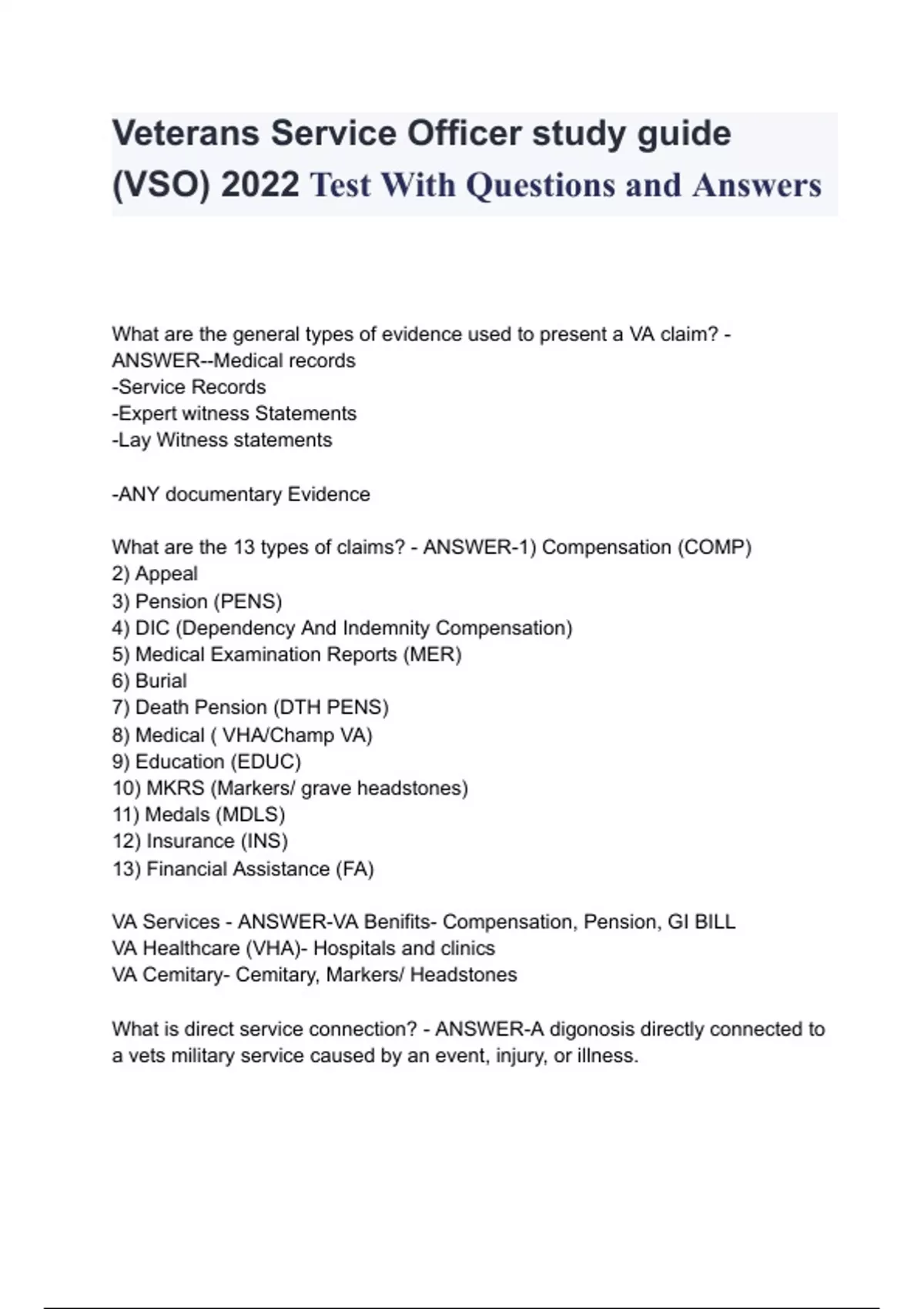 What are the general types of evidence used to present a VA claim? - ANSWER--Medical records -Service Records -Expert witness Statements -Lay Witness statements -ANY documentary Evidence What are the 13 types of claims? - ANSWER-1) Compensation (COMP) 2) Appeal 3) Pension (PENS) 4) DIC (Dependency And Indemnity Compensation) 5) Medical Examination Reports (MER) 6) Burial 7) Death Pension (DTH PENS) 8) Medical ( VHA/Champ VA) 9) Education (EDUC) 10) MKRS (Markers