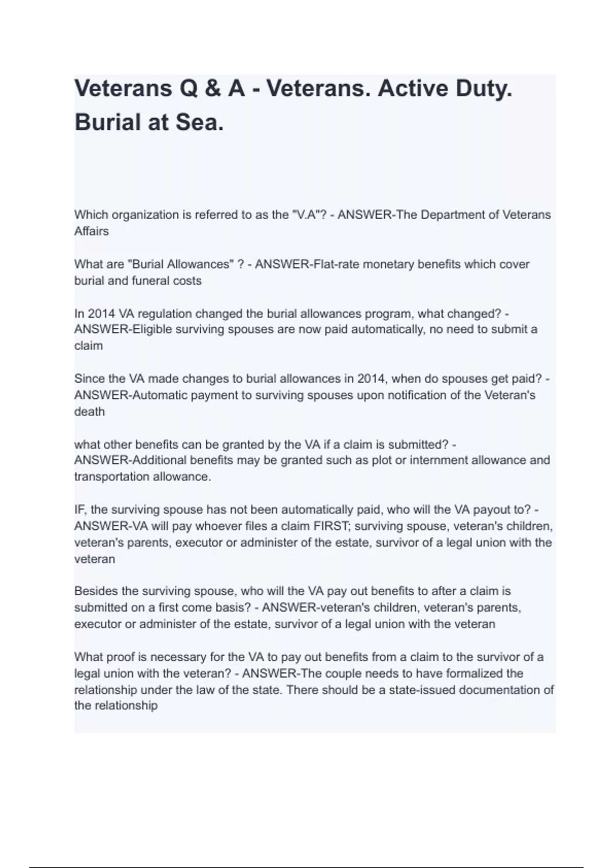 Which organization is referred to as the "V.A"? - ANSWER-The Department of Veterans Affairs What are "Burial Allowances" ? - ANSWER-Flat-rate monetary benefits which cover burial and funeral costs In 2014 VA regulation changed the burial allowances program, what changed? - ANSWER-Eligible surviving spouses are now paid automatically, no need to submit a claim Since the VA made changes to burial allowances in 2014, when do spouses get paid? - ANSWER-Automatic payment to surviving spouses upon notification of the Veteran's death what other benefits can be granted by the VA if a claim is submitted? - ANSWER-Additional benefits may be granted such as plot or internment allowance and transportation allowance. IF, the surviving spouse has not been automatically paid, who will the VA payout to? - ANSWER-VA will pay whoever files a claim FIRST; surviving spouse, veteran's children, veteran's parents, executor or administer of the estate, survivor of a legal union with the veteran Besides the surviving spous