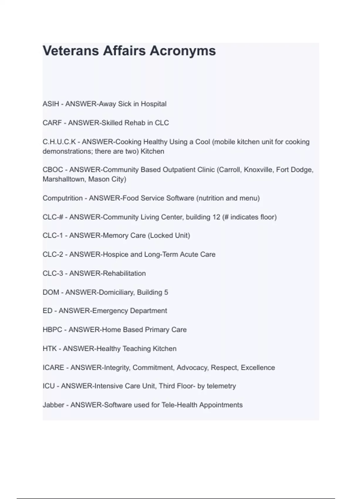 Veterans Affairs Acronyms ASIH - ANSWER-Away Sick in Hospital CARF - ANSWER-Skilled Rehab in CLC C.H.U.C.K - ANSWER-Cooking Healthy Using a Cool (mobile kitchen unit for cooking demonstrations; there are two) Kitchen CBOC - ANSWER-Community Based Outpatient Clinic (Carroll, Knoxville, Fort Dodge, Marshalltown, Mason City) Computrition - ANSWER-Food Service Software (nutrition and menu) CLC-# - ANSWER-Community Living Center, building 12 (# indicates floor) CLC-1 - ANSWER-Memory Care (Locked Unit) CLC-2 - ANSWER-Hospice and Long-Term Acute Care CLC-3 - ANSWER-Rehabilitation DOM - ANSWER-Domiciliary, Building 5 ED - ANSWER-Eme