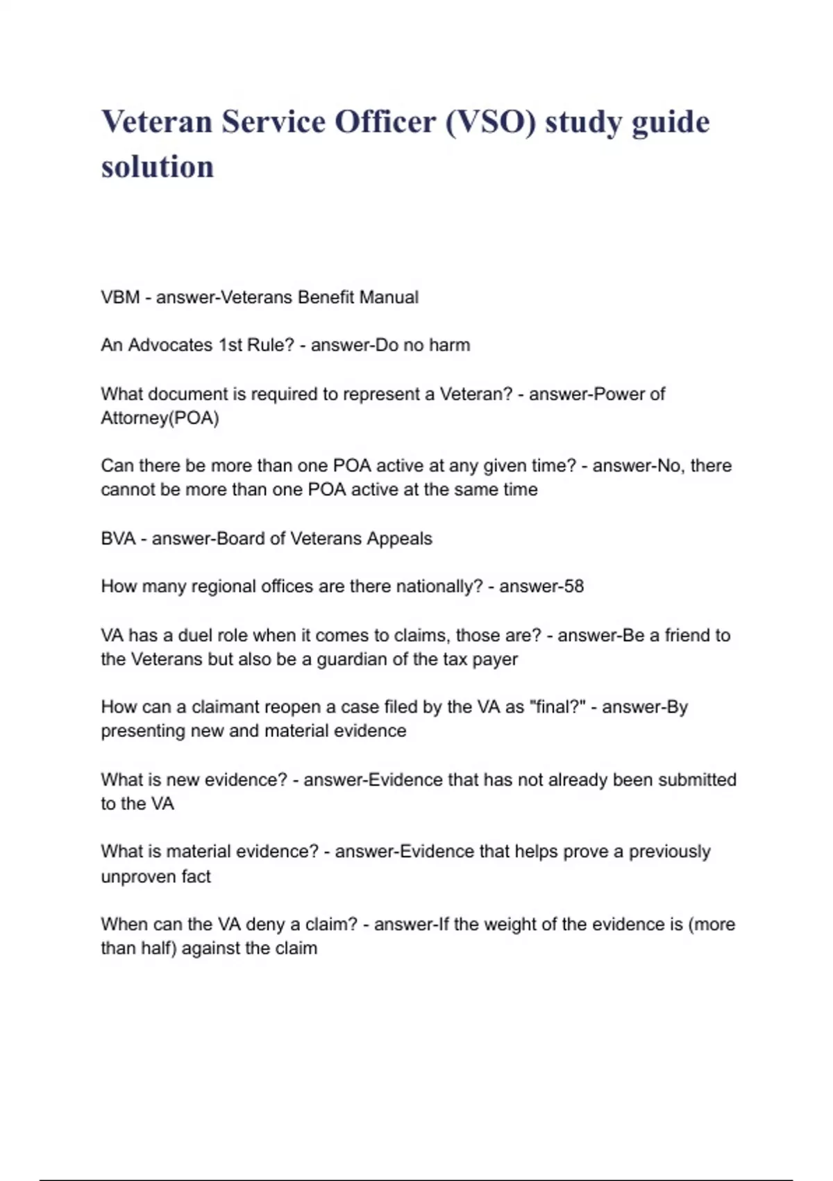 VBM - answer-Veterans Benefit Manual An Advocates 1st Rule? - answer-Do no harm What document is required to represent a Veteran? - answer-Power of Attorney(POA) Can there be more than one POA active at any given time? - answer-No, there cannot be more than one POA active at the same time BVA - answer-Board of Veterans Appeals How many regional offices are there nationally? - answer-58 VA has a duel role when it comes to claims, those are? - answer-Be a friend to the Veterans but also be a guardian of the tax payer How c