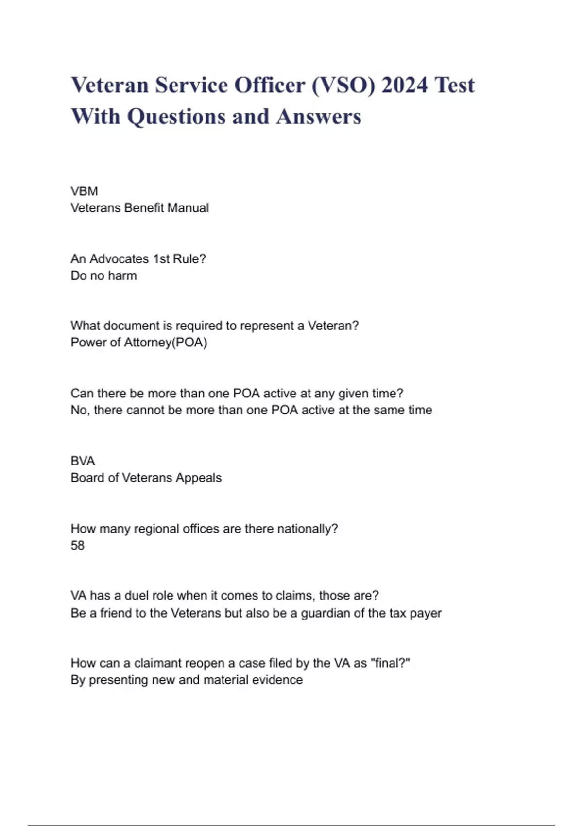 VBM Veterans Benefit Manual An Advocates 1st Rule? Do no harm What document is required to represent a Veteran? Power of Attorney(POA) Can there be more than one POA active at any given time? No, there cannot be more than one POA active at the same time BVA Board of Veterans Appeals How many regi