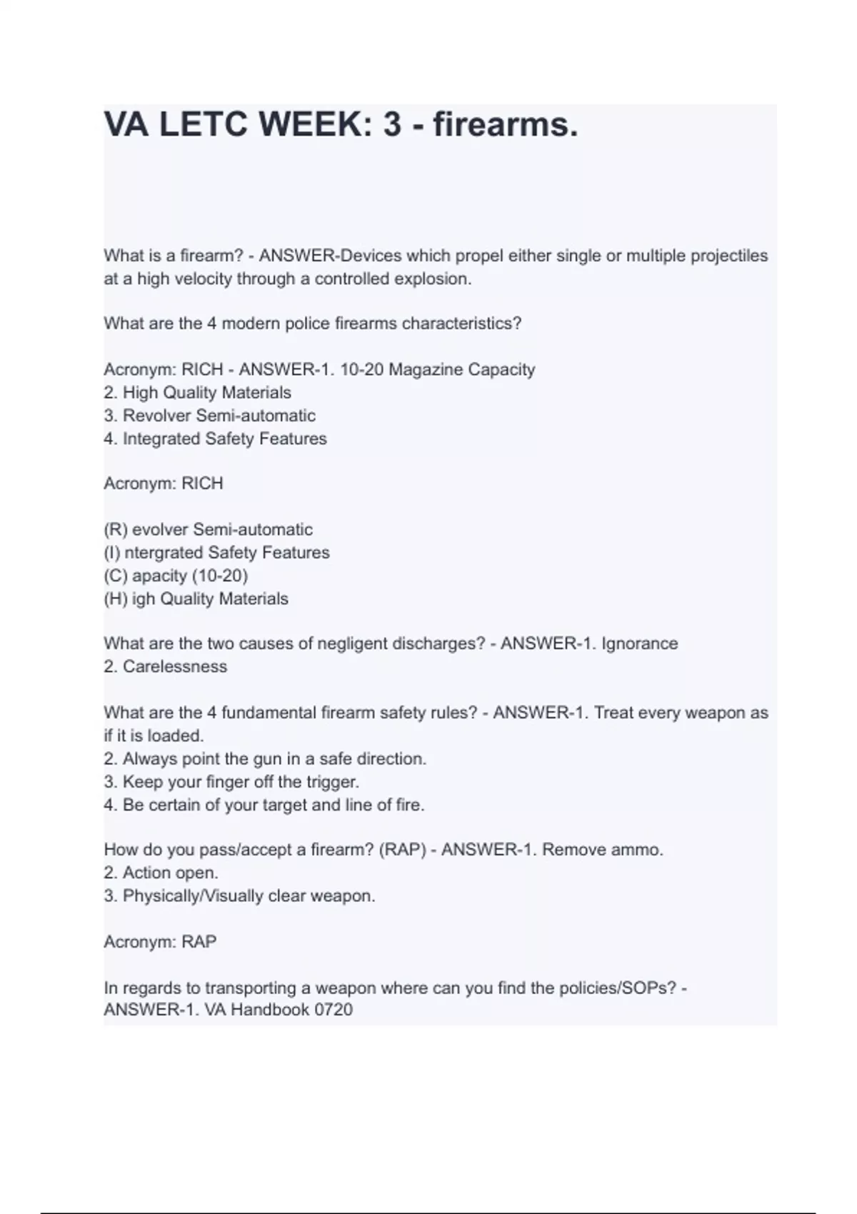 What is a firearm? - ANSWER-Devices which propel either single or multiple projectiles at a high velocity through a controlled explosion. What are the 4 modern police firearms characteristics? Acronym: RICH - ANSWER-1. 10-20 Magazine Capacity 2. High Quality Materials 3. Revolver Semi-automatic 4. Integrated Safety Features Acronym: RICH (R) evolver Semi-automatic (I) ntergrated Safety Features (C) apacity (10-20) (H) igh Quality Materials What are the two causes of negligent discharges? - ANSWER-1. Ignorance 2. Carelessness What are the 4 fundamental firearm safety rules? - ANSWER-1. Treat every weapon as if it is loaded. 2. Always point the gun in a safe direction. 3. Keep your finger off the trigger. 4. Be certain of your target and line of fire. How do you pass/accept a firearm? (RAP) - ANSWER-1. Remove ammo. 2. Action open. 3