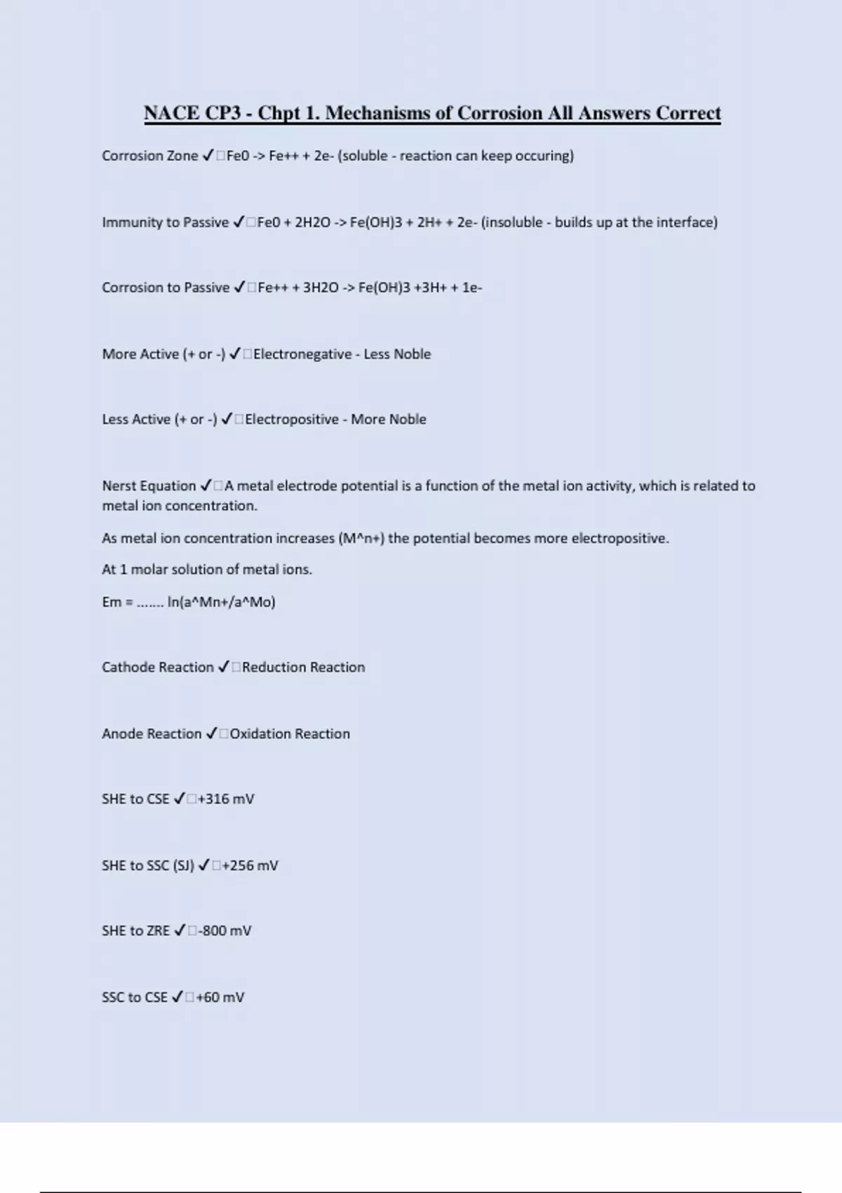 NACE CP3 - Chpt 1. Mechanisms of Corrosion All Answers Correct Corrosion Zone ️Fe0 -> Fe++ + 2e- (soluble - reaction can keep occuring) Immunity to Passive ️Fe0 + 2H2O -> Fe(OH)3 + 2H+ + 2e- (insoluble - builds up at the interface) Corrosion to Passive ️Fe++ + 3H2O -> Fe(OH)3 +3H+ + 1e- More Active (+ or -) ️Electronegative - Less Noble Less Active (+ or -) ️Electropositive - More Noble Nerst Equation ️A metal electrode potential is a function of the metal ion activity, which is related to metal ion concentration. As metal ion concentration increases (M^n+) the potential becomes more electropositive. At 1 molar solution of metal ions. Em = ....... ln(a^Mn+/a^Mo) Cathode Reaction ️Reduction Reaction Anode Reaction ️Oxidation Reaction SHE to CSE ️+316 mV SHE to SSC (SJ) ️+256 mV SHE to ZRE ️-800 mV SSC to CSE ️+60 mV In non-aerated soils and waters the typical reduction reaction is ... ️Reduction of Hydrogen H+ + e- -> Ho In aerated soils and waters the typical reduction reaction is ... ️Reduction of Oxygen O2 + 2H2O + 4e- -> 4OH- Corrosion Current in a Corrosion Cell ️Direction of positive charges flow. Anode to Cathode through the electrolyte and from cathode to anode in the metalic path. Define Polarization ️The electrical energy used up in the transfer of charge across the respective metal/electrolyte interfaces. Build up of product. Increase in polarization is a slowing down of the charge transfer reaction. Faraday's Law ️Material lost at the anode or deposited at the cathode is a function of atomic weight of the metal number of charges transferred corrosion current Cathode Depolarization Increase ️Anything that increases the rate of charge transfer across the interface. Increased H+ Increased aeration Increased agitation Increased temperature Increased surface area Increase iac Anode Depolarization Increase ️Anything that increases the rate of the oxidation reaction.