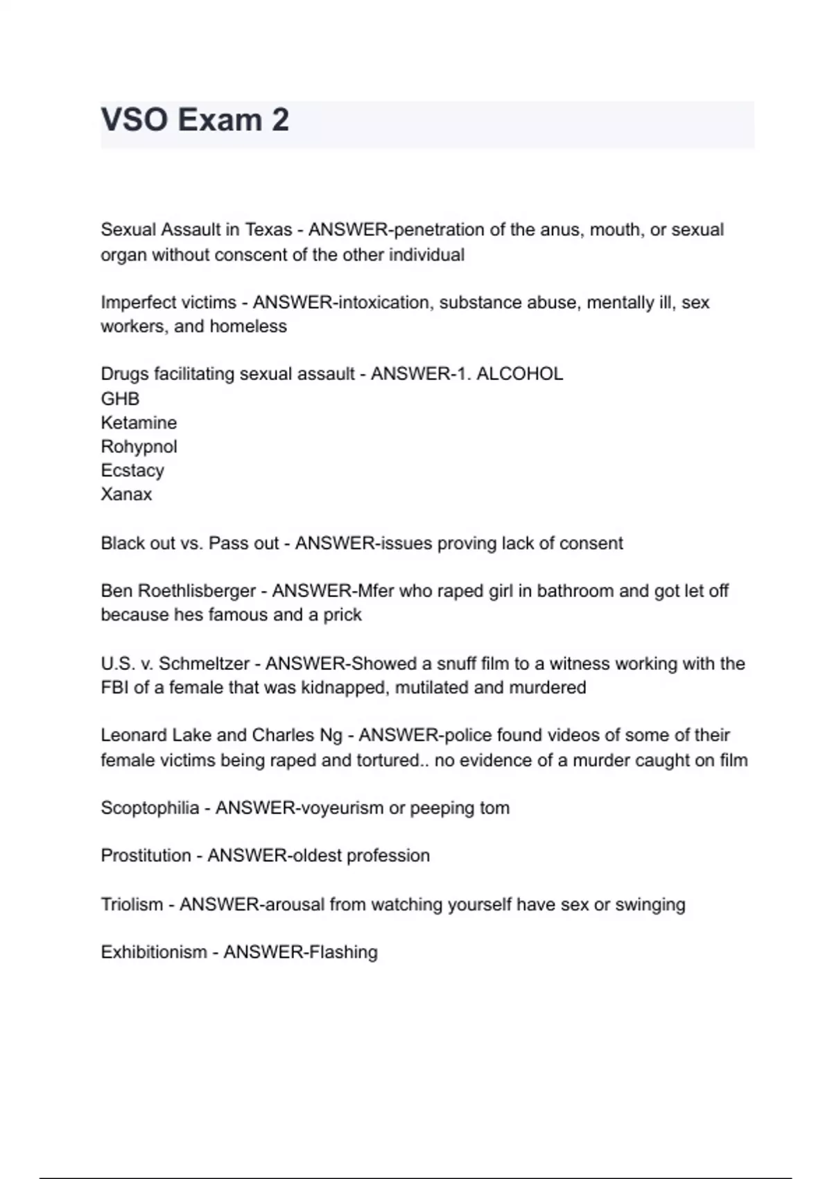 Sexual Assault in Texas - ANSWER-penetration of the anus, mouth, or sexual organ without conscent of the other individual Imperfect victims - ANSWER-intoxication, substance abuse, mentally ill, sex workers, and homeless Drugs facilitating sexual assault - ANSWER-1. ALCOHOL GHB Ketamine Rohypnol Ecstacy Xanax Black out vs. Pass out - ANSWER-issues proving lack of consent Ben Roethlisberger - ANSWER-Mfer who raped girl in bathroom and got let off because hes famous and a prick U.S. v. Schmeltzer - ANSWER-Showed a snuff film to a witness working with the FBI of a female that was kidnapped, mutilated and murdered Leonard Lake and Charles Ng - ANSWER-police found videos of some of their female victims being raped and tortured.. no evidence of a murder caught on film Scoptophilia - ANSWER-voyeurism or peeping tom Prostitution - ANSWER-old