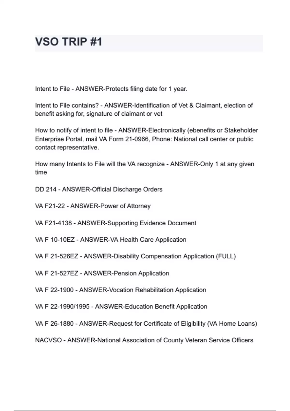 Intent to File - ANSWER-Protects filing date for 1 year. Intent to File contains? - ANSWER-Identification of Vet & Claimant, election of benefit asking for, signature of claimant or vet How to notify of intent to file - ANSWER-Electronically (ebenefits or Stakeholder Enterprise Portal, mail VA Form 21-0966, Phone: National call center or public contact representative. How many Intents to File will the VA recognize - ANSWER-Only 1 at any given time DD 214 - ANSWER-Official Discharge Orders VA F21-22 - ANSWER-Power of Attorney VA F21-4138 - ANSWER-Supporting Evidence Document VA F 10-10EZ - ANSWER-VA Health Care Application VA F 21-526EZ - ANSWER-Disability Compensation Application (FULL) VA F 21-527EZ - ANSW