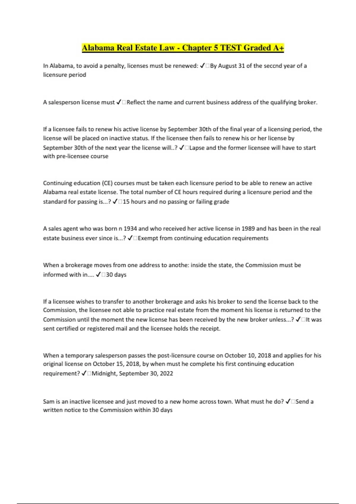 Alabama Real Estate Law - Chapter 5 TEST Graded A+ In Alabama, to avoid a penalty, licenses must be renewed: ️By August 31 of the seccnd year of a licensure period A salesperson license must ️Reflect the name and current business address of the qualifying broker. If a licensee fails to renew his active license by September 30th of the final year of a licensing period, the license will be placed on inactive status. If the licensee then fails to renew his or her license by September 30th of the next year the license will..? ️Lapse and the former licensee will have to start with pre-licensee course Continuing education (CE) courses must be taken each licensure period to be able to renew an active Alabama real estate license. The total number of CE hours required during a licensure period and the standard for passing is...? ️15 hours and no passing or failing grade A sales agent who was born n 1934 and who received her active license in 1989 and has been in the real estate business ever since is...? ️Exempt from continuing education requirements When a brokerage moves from one address to anothe: inside the state, the Commission must be informed with in.... ️30 days If a licensee wishes to transfer to another brokerage and asks his broker to send the license back to the Commission, the licensee not able to practice real estate from the moment his license is returned to the Commission until the moment the new license has been received by the new broker unless...? ️It was sent certified or registered mail and the licensee holds the receipt. When a temporary salesperson passes the post-licensure course on October 10, 2018 and applies for his original license on October 15, 2018, by when must he complete his first continuing education requirement? ️Midnight, September 30, 2022 Sam is an inactive licensee and just moved to a new home across town. What must he do? ️Send a written notice to the Commission within 30 days How many hours of continuing education must consist of state-approved electives? ️9 hours All of the following statements are true about continuing education EXCEPT? ️If a licensee completes more than 15 hours, the extra hours can carry over to the next renewal period. When a licensee wishes to change her qualifying broker, all of the following must happen EXCEPT? ️The old qualifying broker must give written notice to the Commission. When is the final deadline fcr completing the CE requirement? ️By September 30th of every even year A brokerage company that includes two company licenses, 14 salespeople licenses, and four associate broker licenses. Tc keep the company operating legally in Alabama, how many licenses total will be renewed with the Commission? ️22 A licensee has been inactive for three years. In order to reactivate his license, he must do all of the following EXCEPT? ️If the licensee did not complete the required CE hours for the last license period, he will need to complete only the 6 hours of risk management, take the required CE for the current year and pay the required fees. When must an Alabama real estate license be renewed to avoid paying a late fee penalty? ️August 31st of the even years During the listing appointment, out-of-town sellers agreed to list the home with a salesperson and signed the listing agreement. Upon returning to the office, the licensee learns that her broker returned her license to the Commission. What should the licensee do now? ️Find a new qualifying broker All of the following are requirements for the license certificate of an associate broker EXCEPT: ️Being carried by the associate broker at all times. What is the required risk management course that ALL licensees must take? ️Basic Risk Management Avoiding Violations All of the following statements are true about continuing education EXCEPT? ️Time served in the
